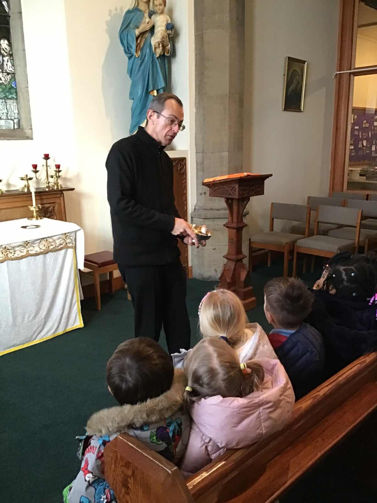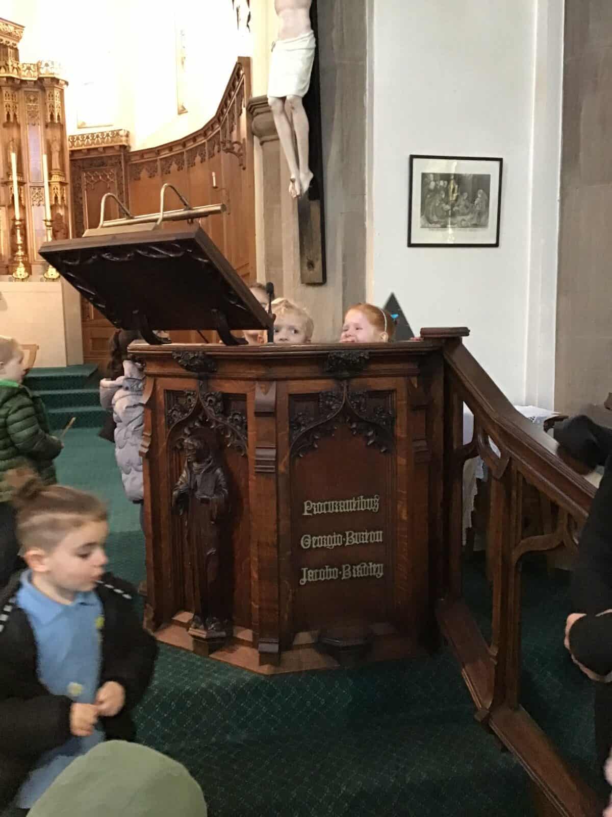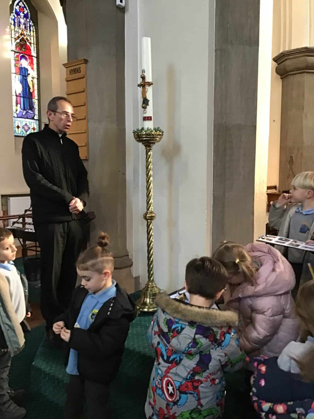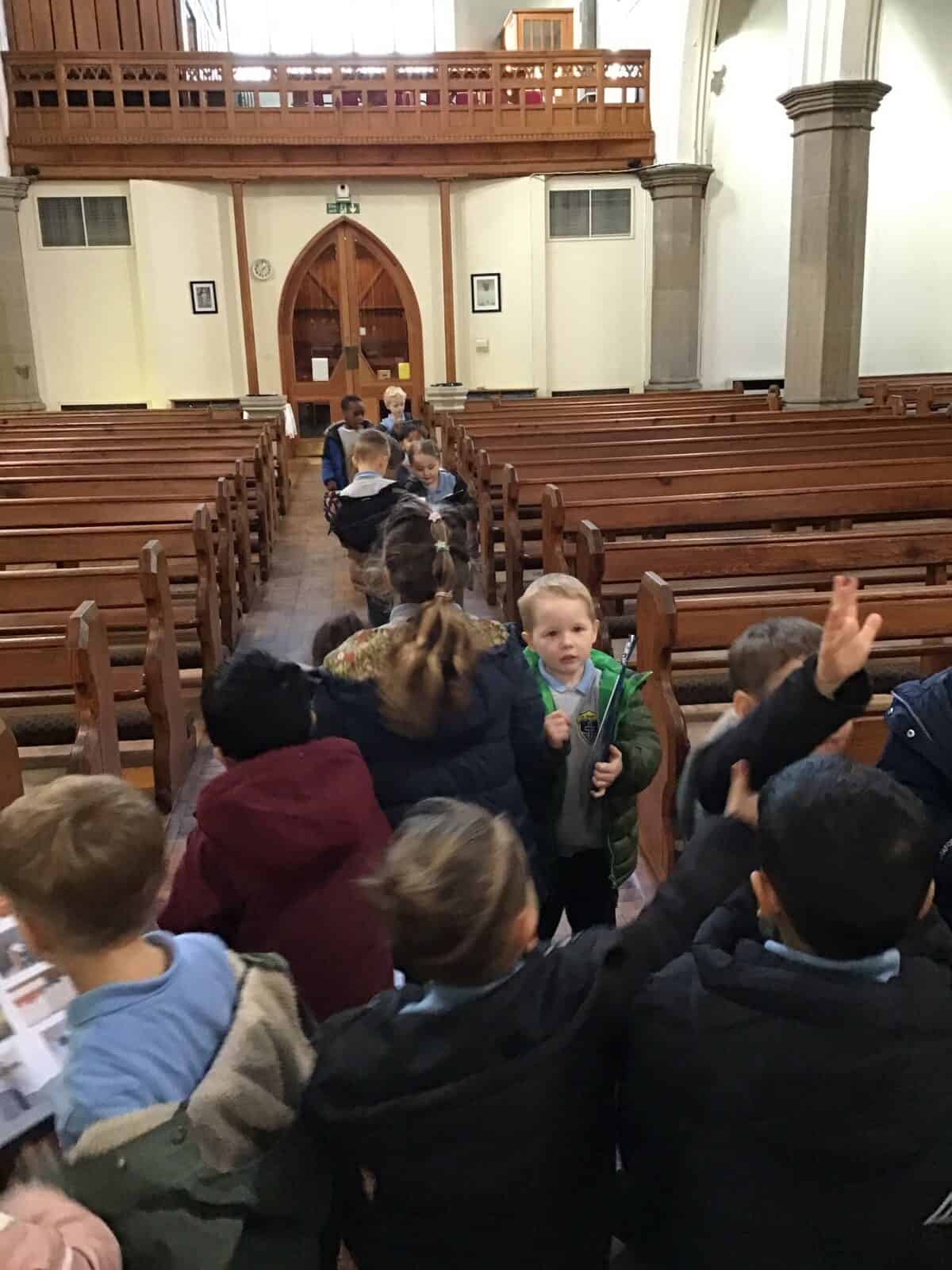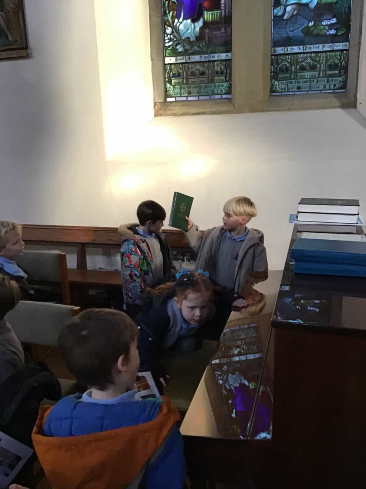 This afternoon the children visited Father Bill to find out all about celebrations that take place in a church. The children listened carefully to Father Bill explain how different parts/artefacts in church are used during these celebrations. The children then got the opportunity to look around the church themselves, ticking on their ‘I Spy’ sheets when they found the; font, pews, church door, lectern, alter, hymn books, candle and cross.