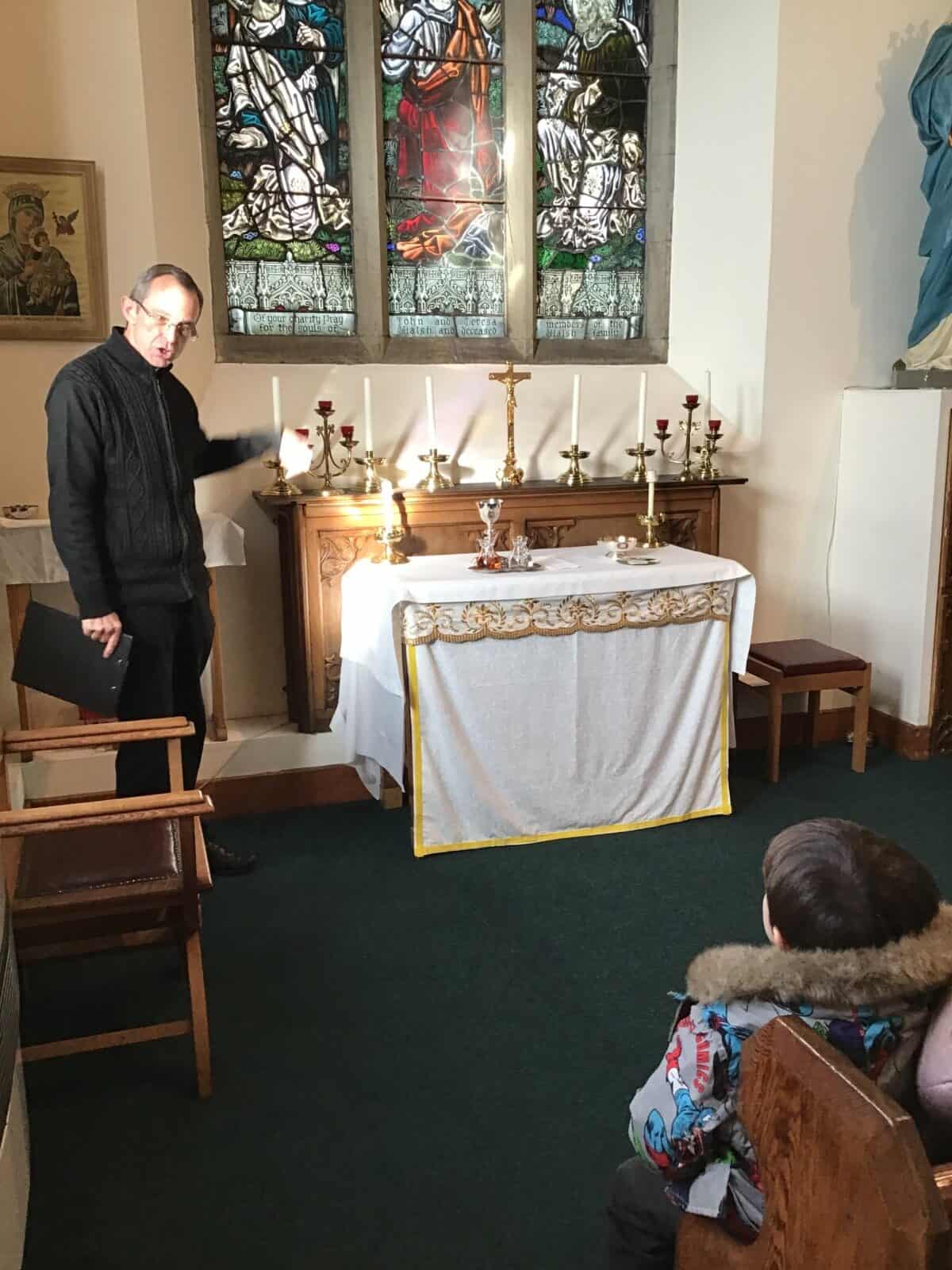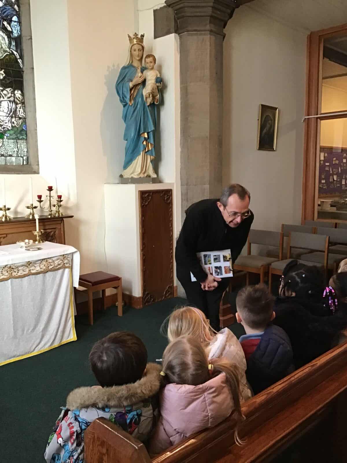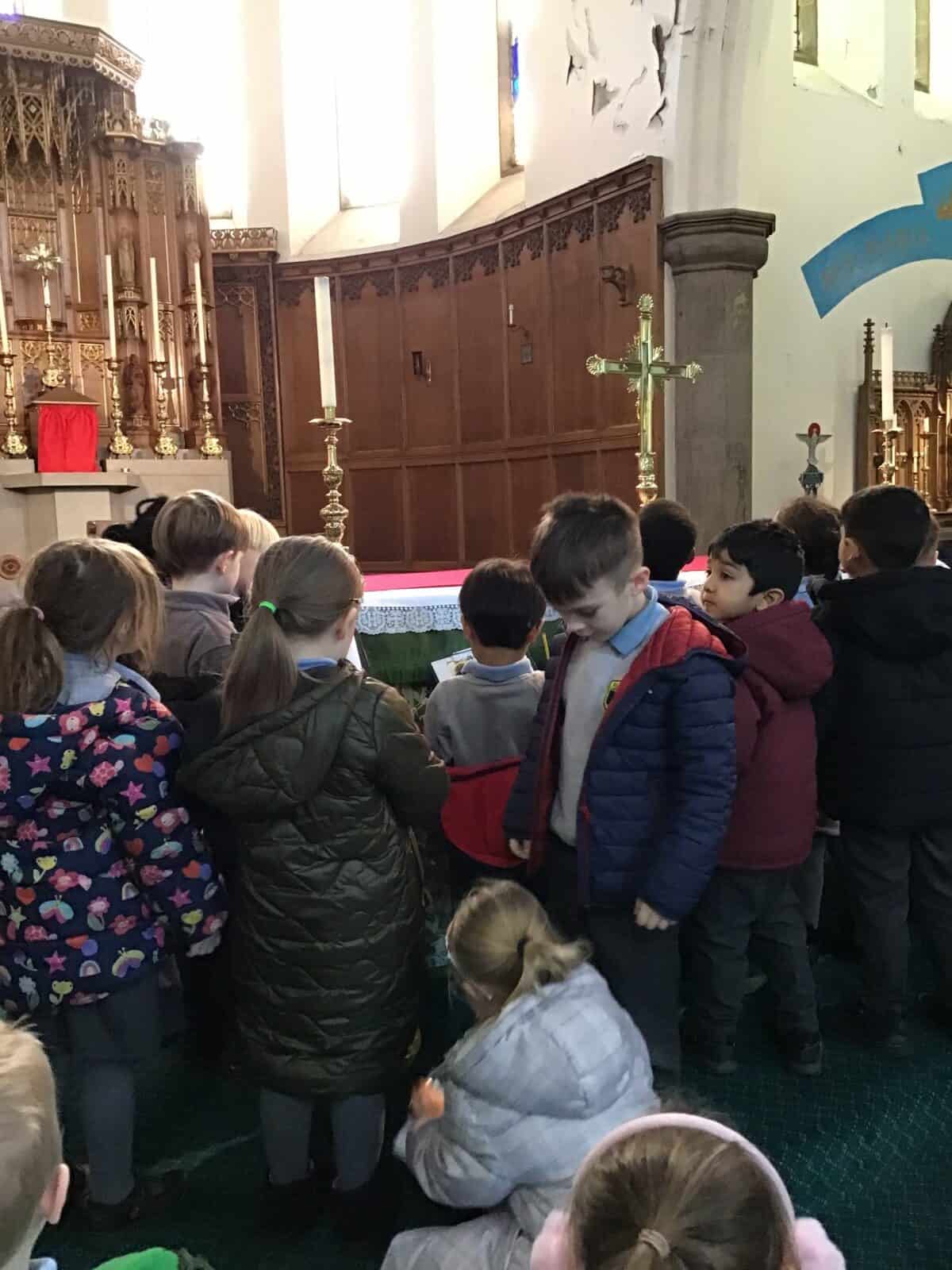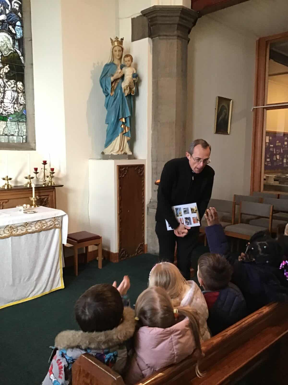 This afternoon the children visited Father Bill to find out all about celebrations that take place in a church. The children listened carefully to Father Bill explain how different parts/artefacts in church are used during these celebrations. The children then got the opportunity to look around the church themselves, ticking on their ‘I Spy’ sheets when they found the; font, pews, church door, lectern, alter, hymn books, candle and cross.