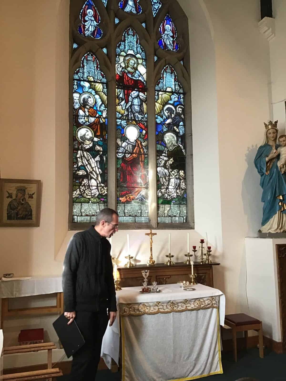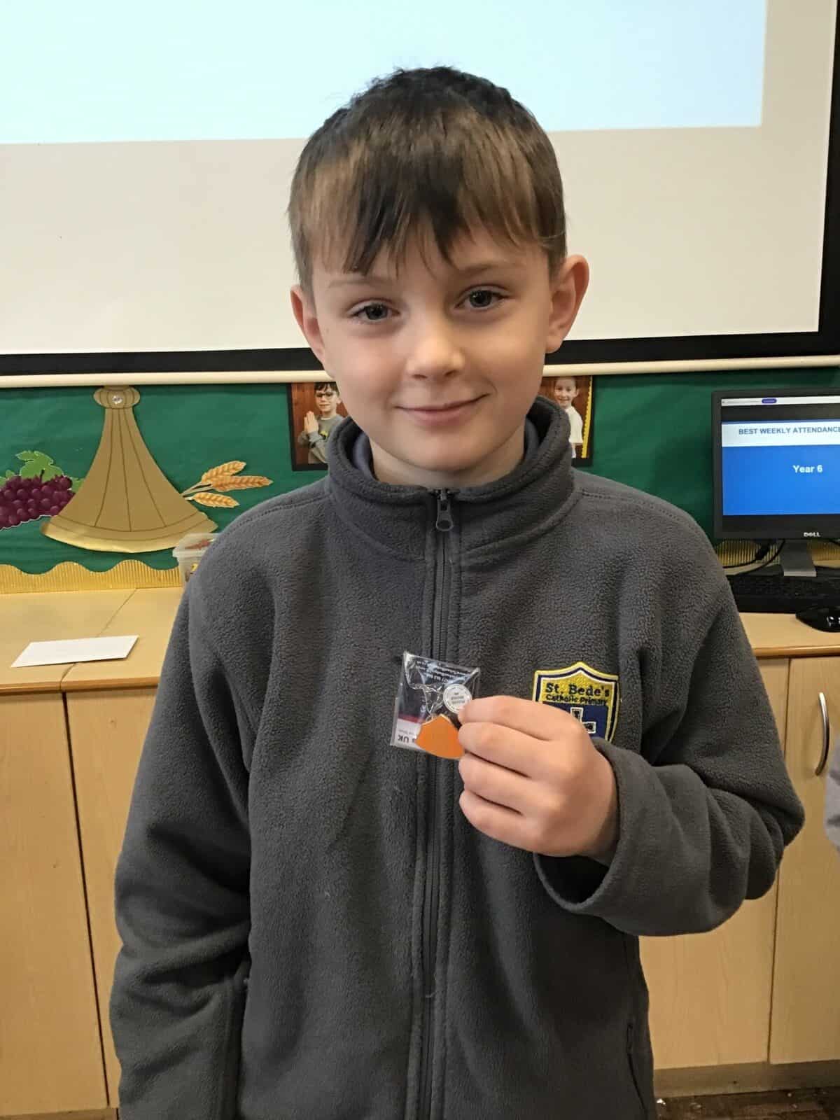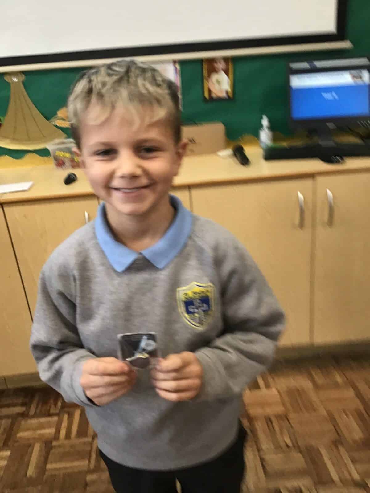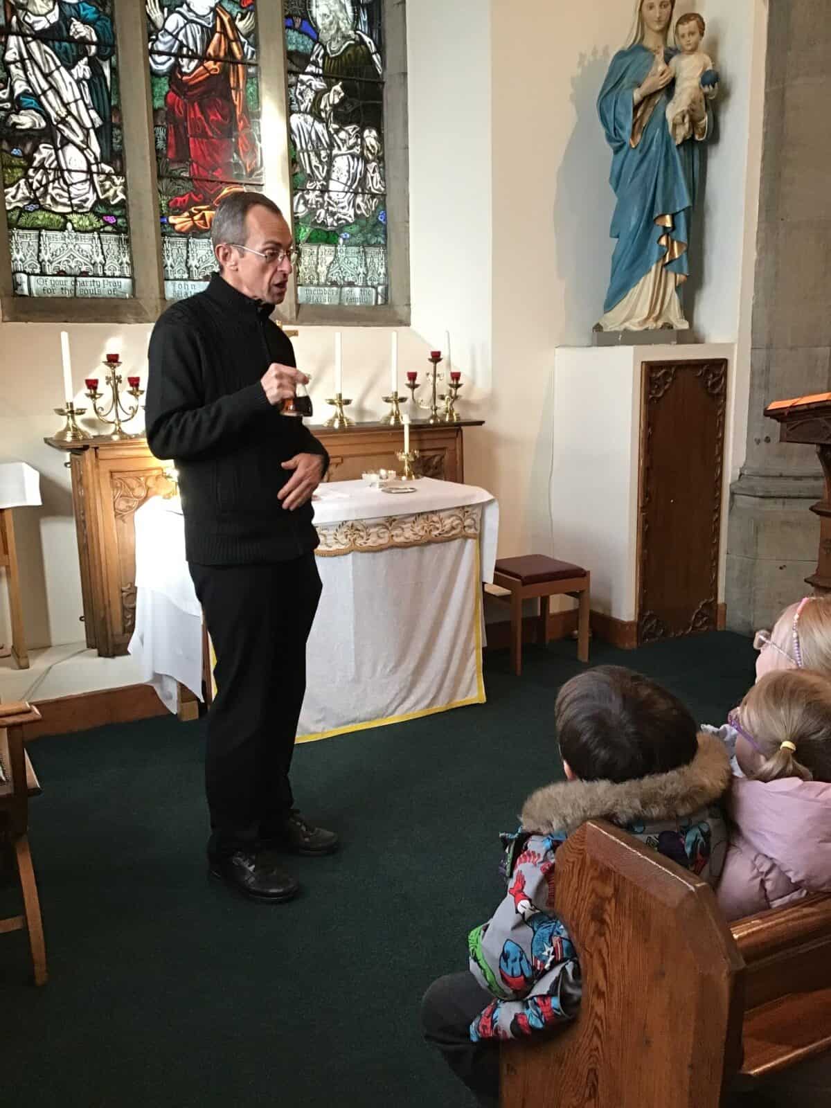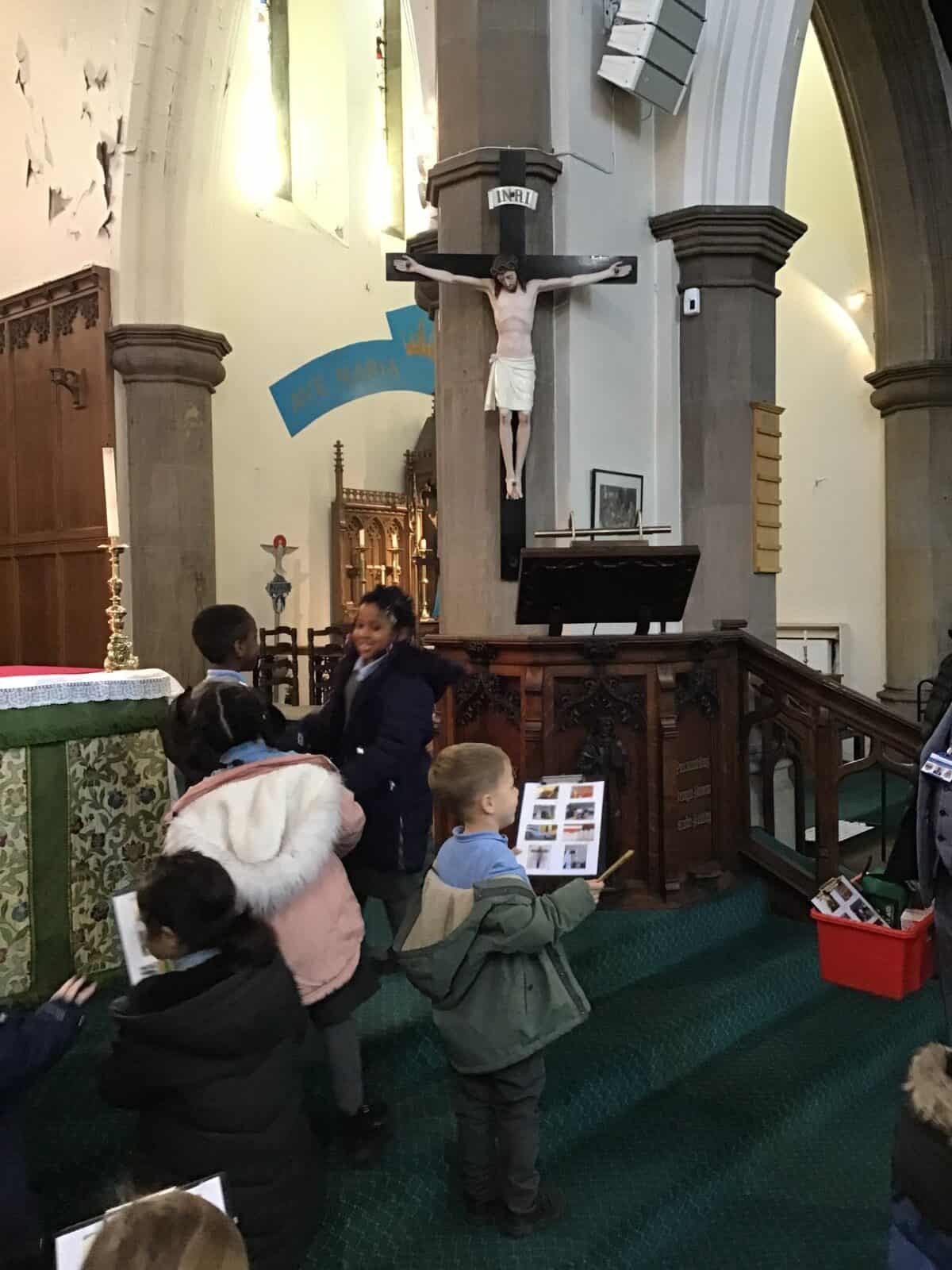 This afternoon the children visited Father Bill to find out all about celebrations that take place in a church. The children listened carefully to Father Bill explain how different parts/artefacts in church are used during these celebrations. The children then got the opportunity to look around the church themselves, ticking on their ‘I Spy’ sheets when they found the; font, pews, church door, lectern, alter, hymn books, candle and cross.