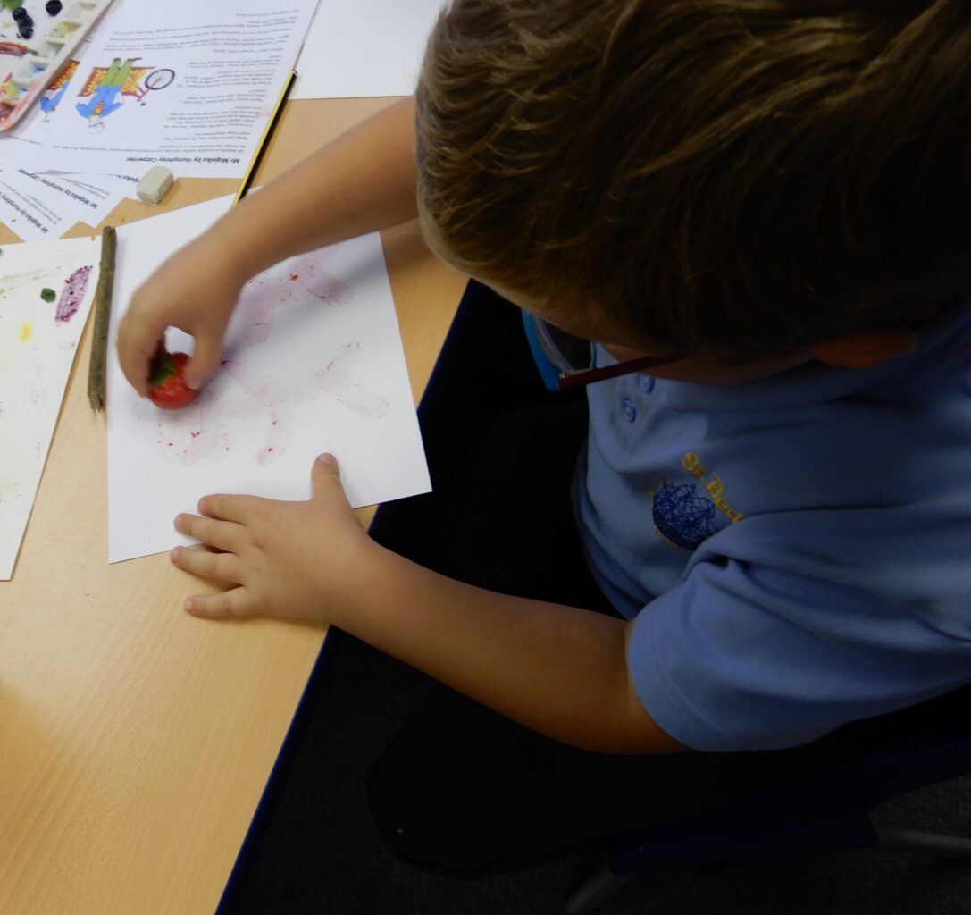 The children experimented using natural materials to make shapes and lines. They used berries, leaves, charcoal and spices like cave men would have done thousands of years ago!