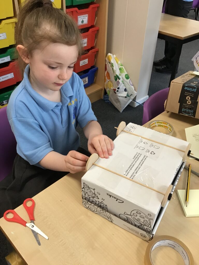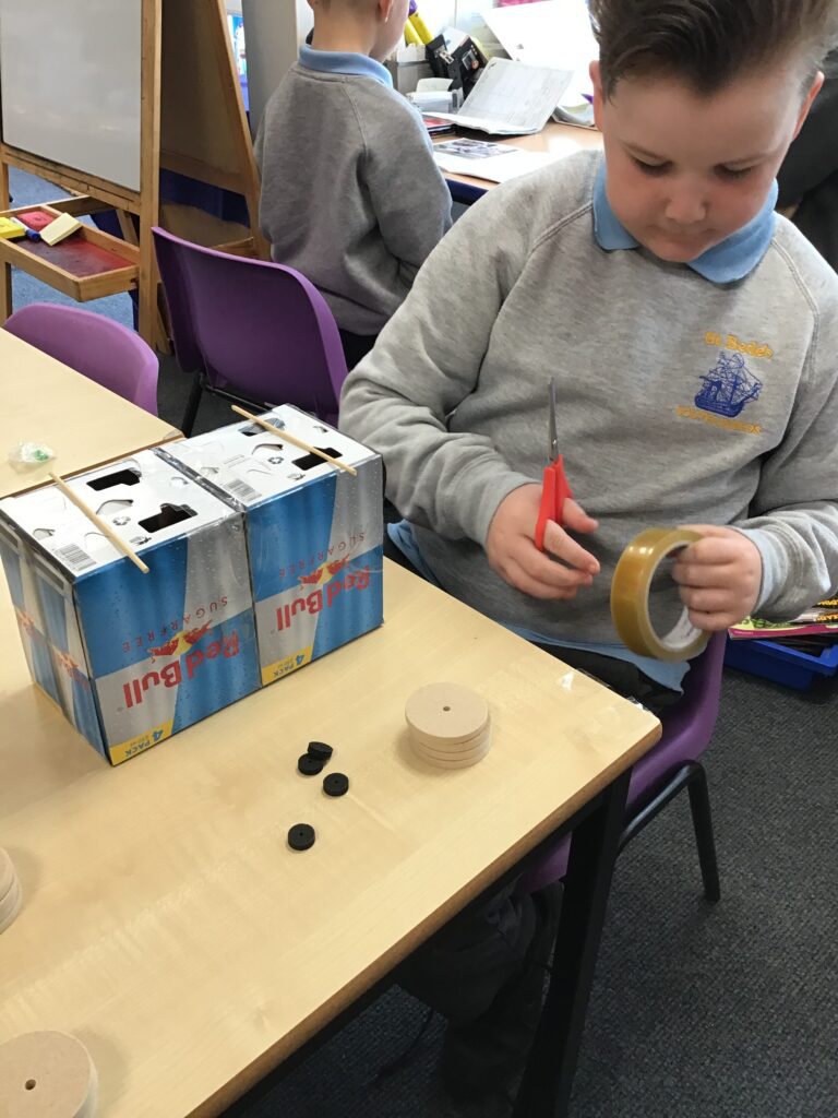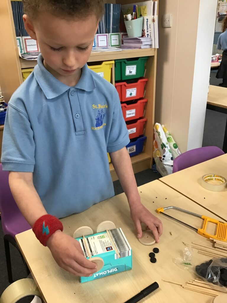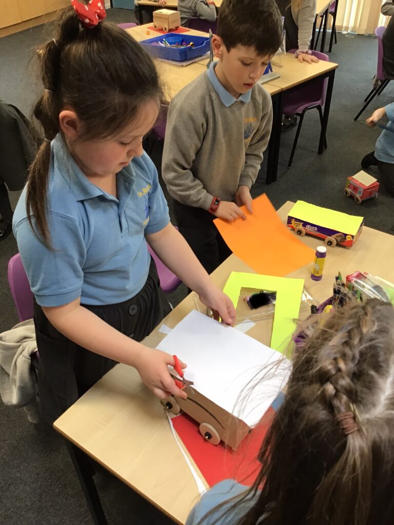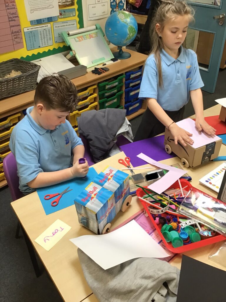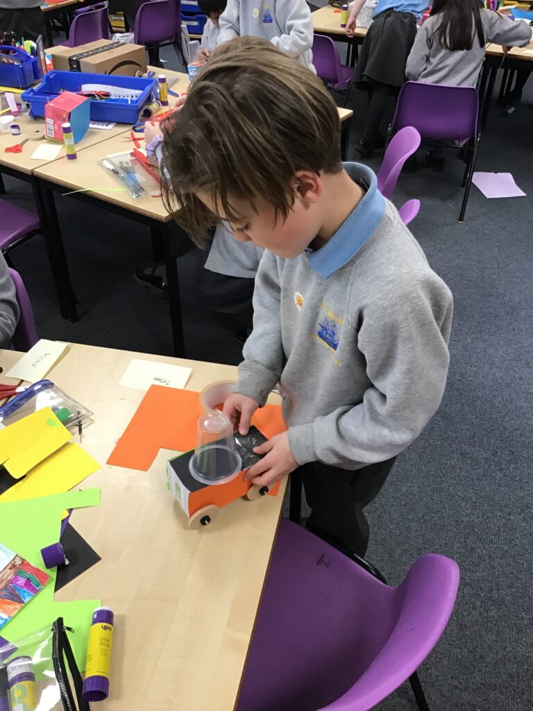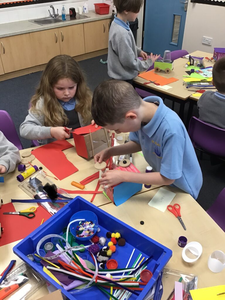 Today Year 2 created vehicles as part of their Design and Technology unit, wheels and axles. The children used their designs from the previous lesson to create their wonderful vehicles. They used a range of tools to cut wooden axles and used washers to secure each wheel. They explored a range of materials to help make their vehicles stronger and more stable. To finish the children used lots of crafts to finish and embellish their vehicles, using bottle tops for lids and seats! Here are some pictures of the children in action and also their final products.