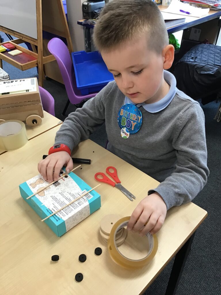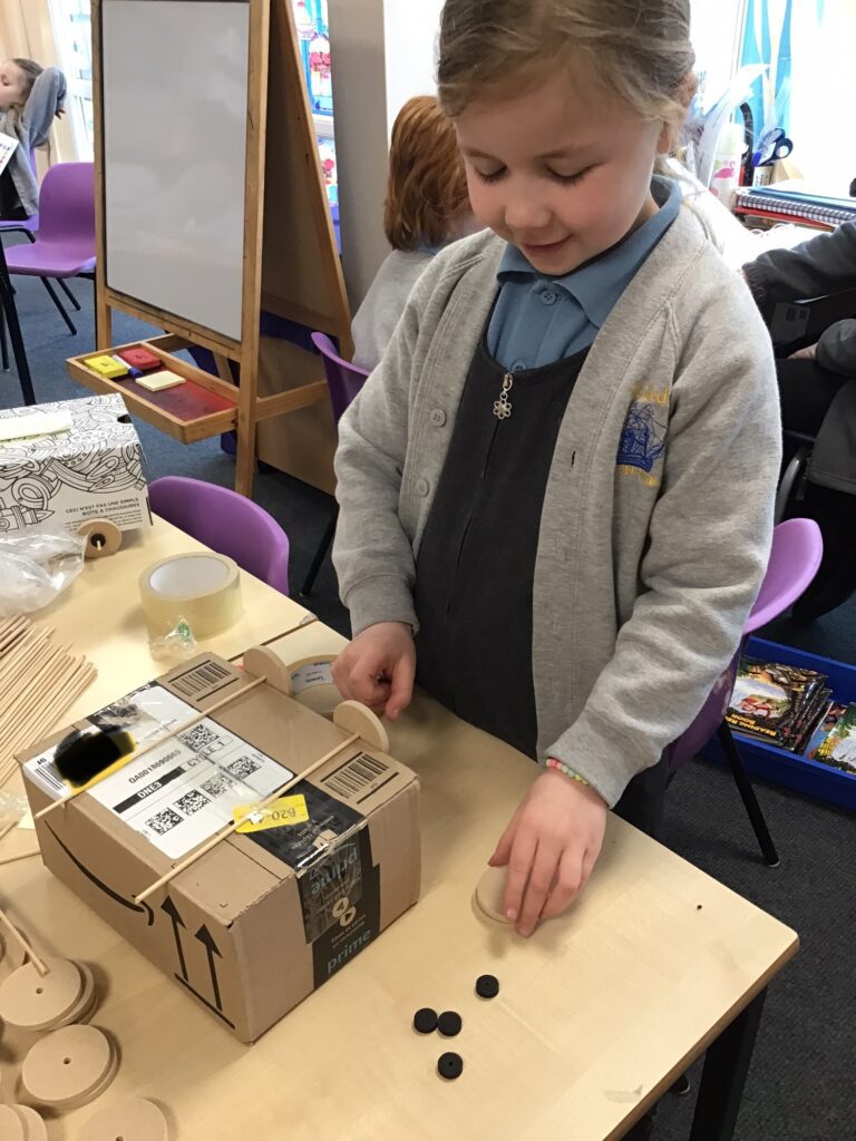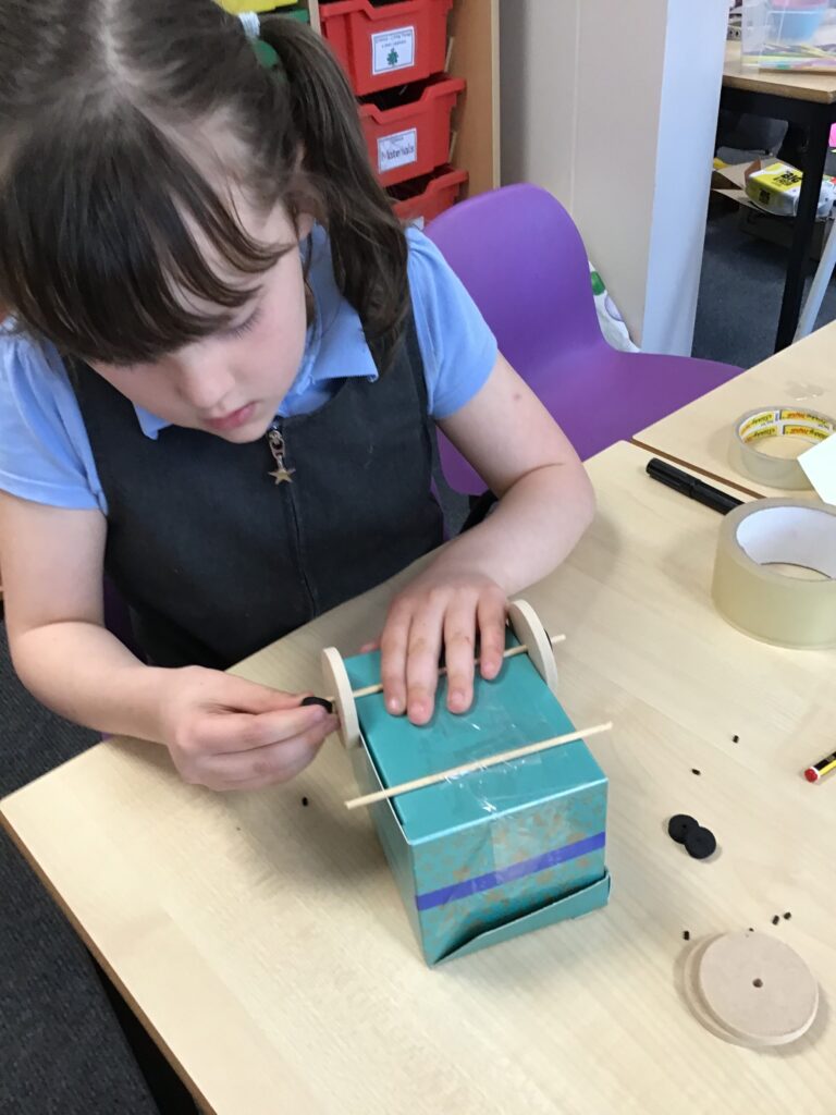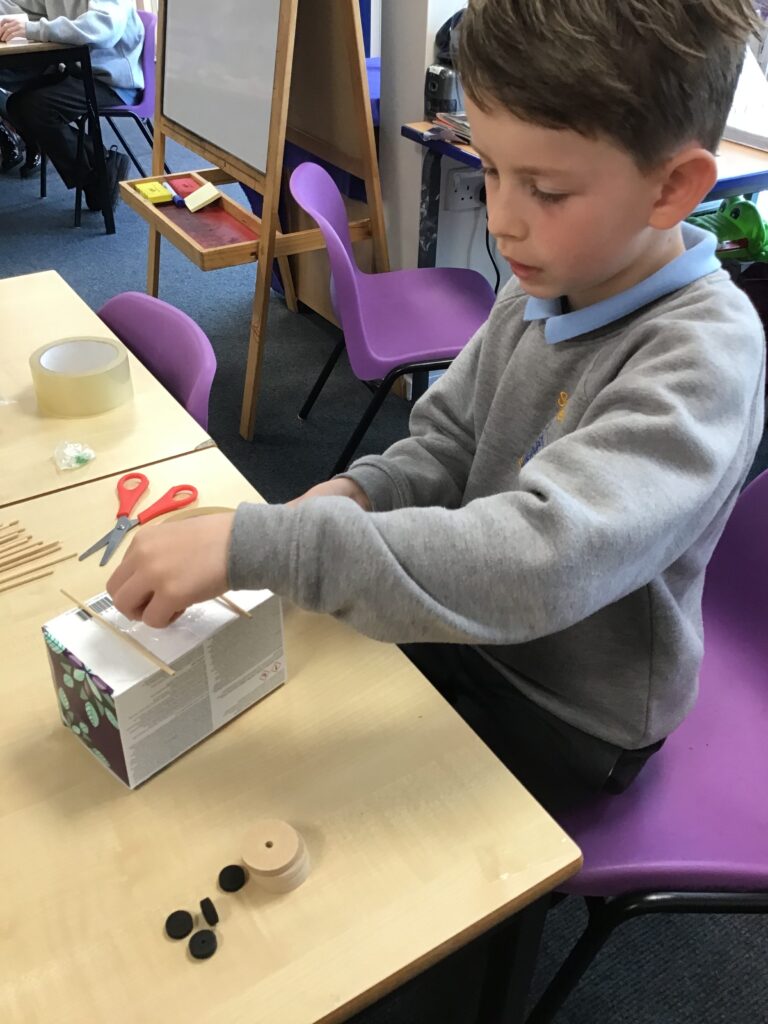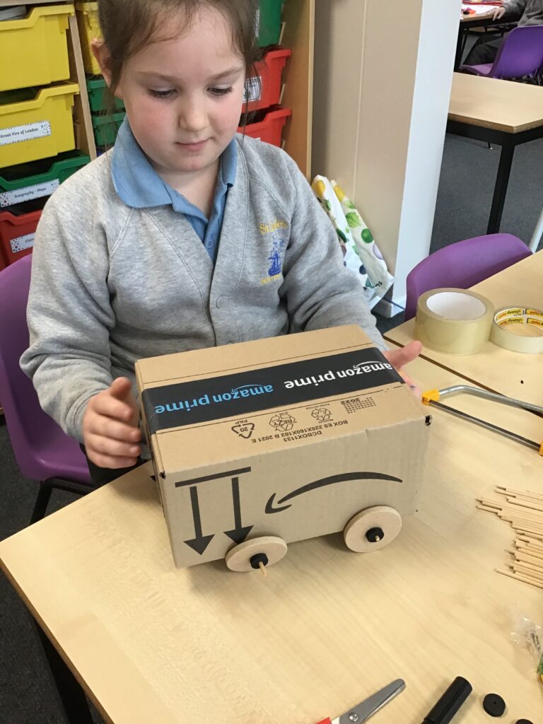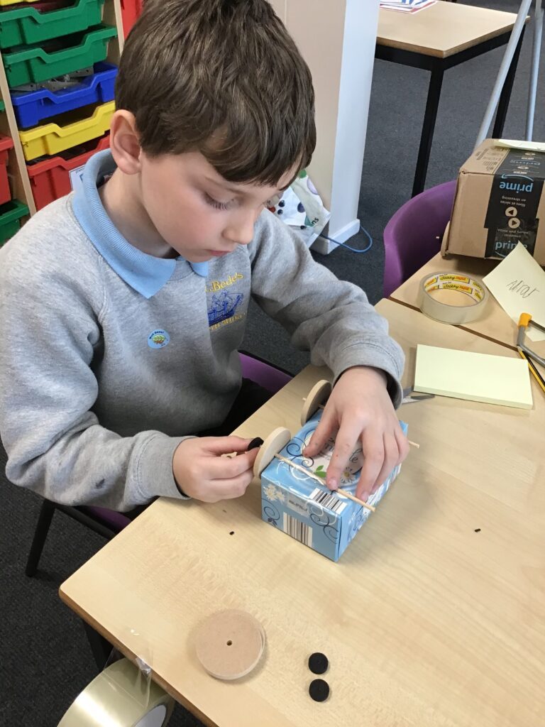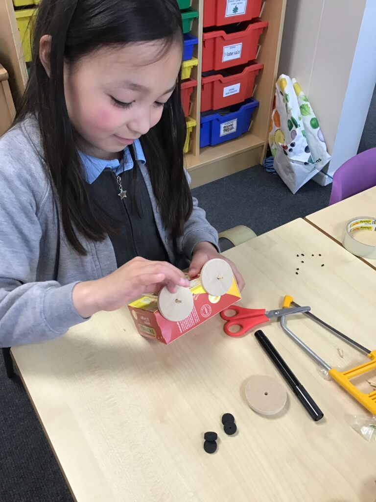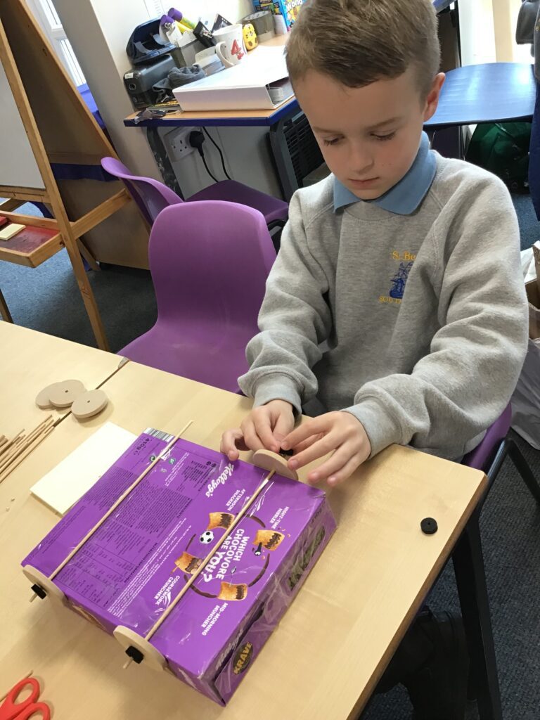 Today Year 2 created vehicles as part of their Design and Technology unit, wheels and axles. The children used their designs from the previous lesson to create their wonderful vehicles. They used a range of tools to cut wooden axles and used washers to secure each wheel. They explored a range of materials to help make their vehicles stronger and more stable. To finish the children used lots of crafts to finish and embellish their vehicles, using bottle tops for lids and seats! Here are some pictures of the children in action and also their final products.