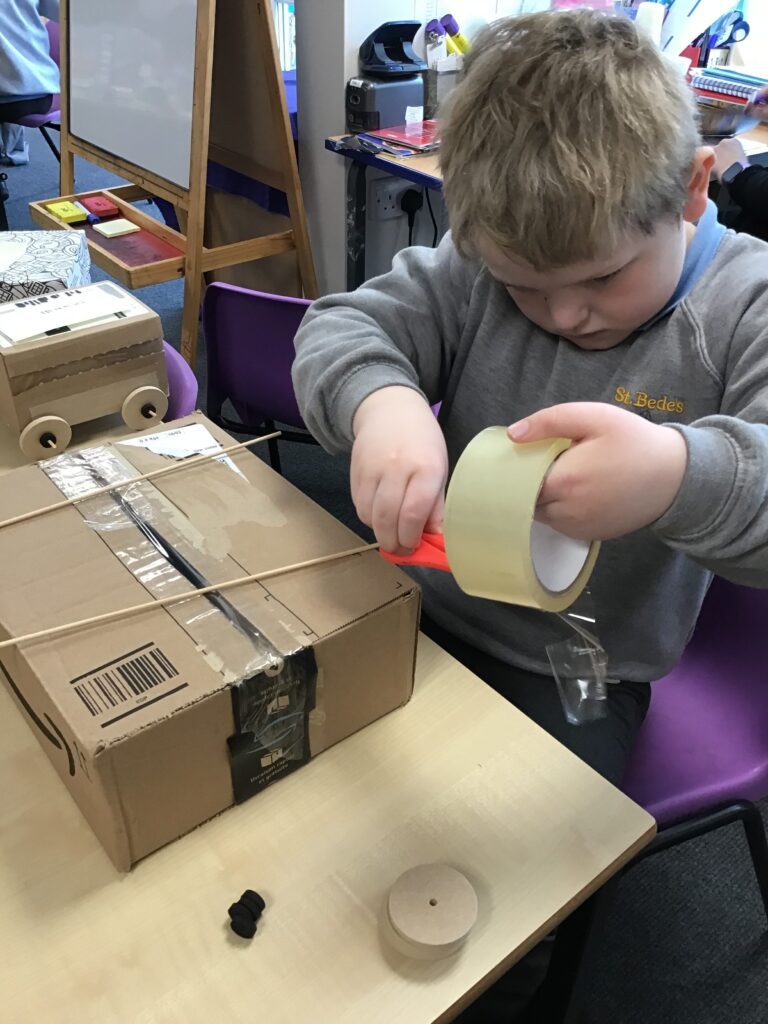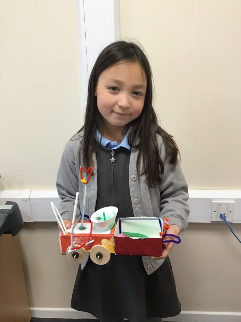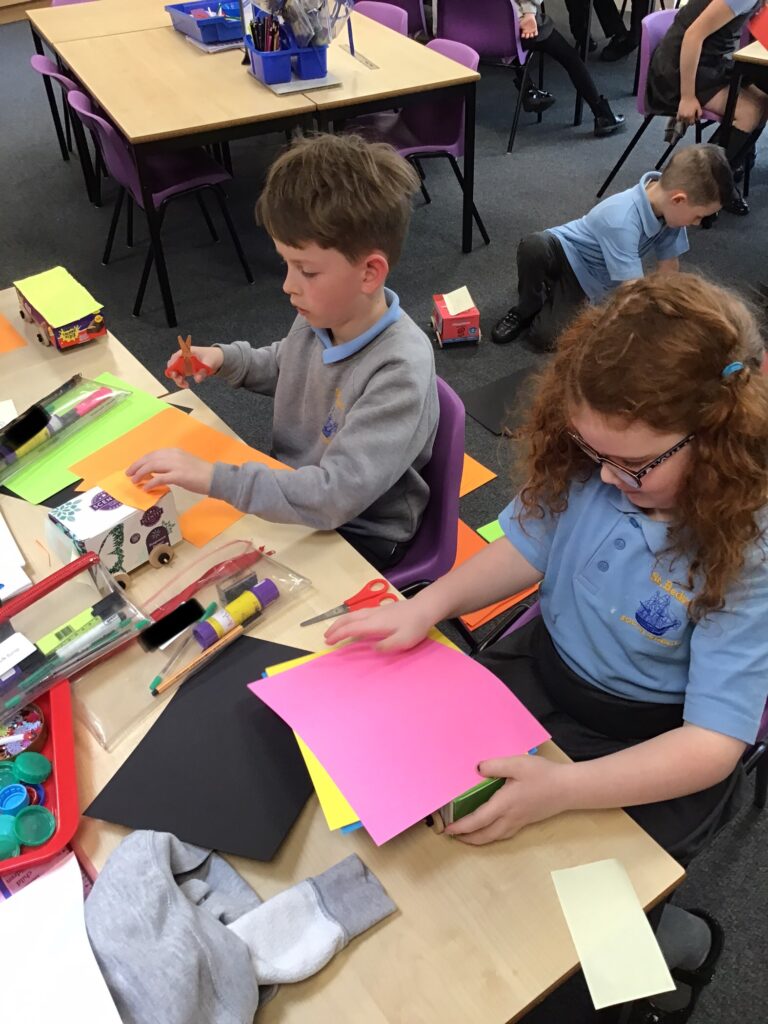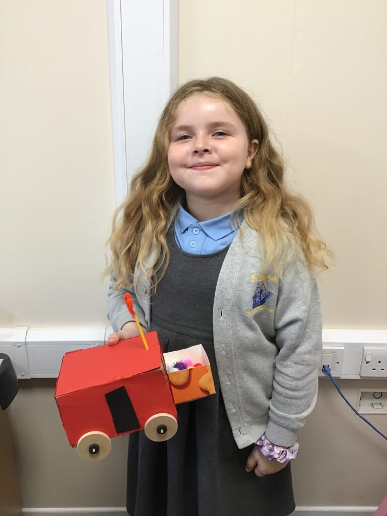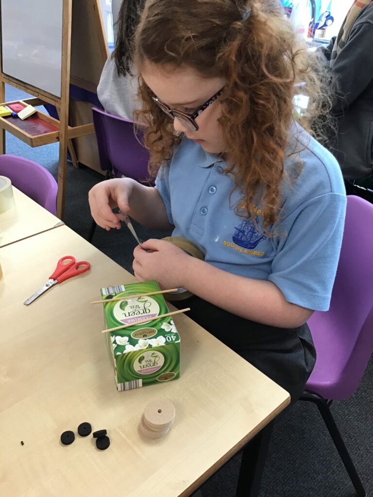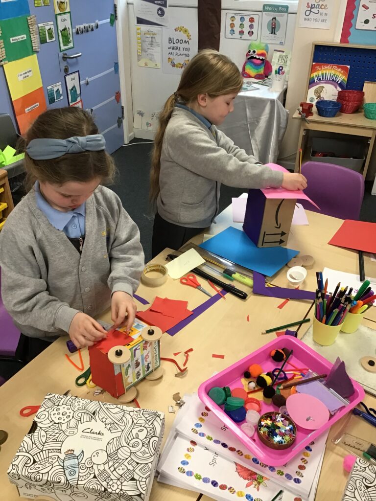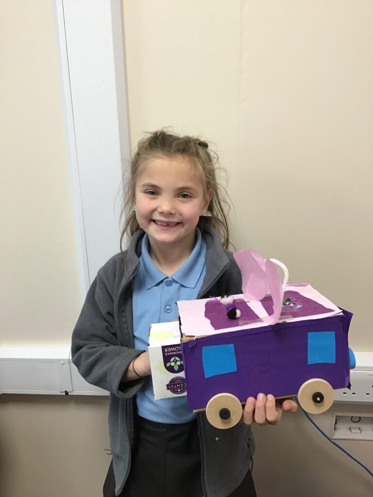 Today Year 2 created vehicles as part of their Design and Technology unit, wheels and axles. The children used their designs from the previous lesson to create their wonderful vehicles. They used a range of tools to cut wooden axles and used washers to secure each wheel. They explored a range of materials to help make their vehicles stronger and more stable. To finish the children used lots of crafts to finish and embellish their vehicles, using bottle tops for lids and seats! Here are some pictures of the children in action and also their final products.
