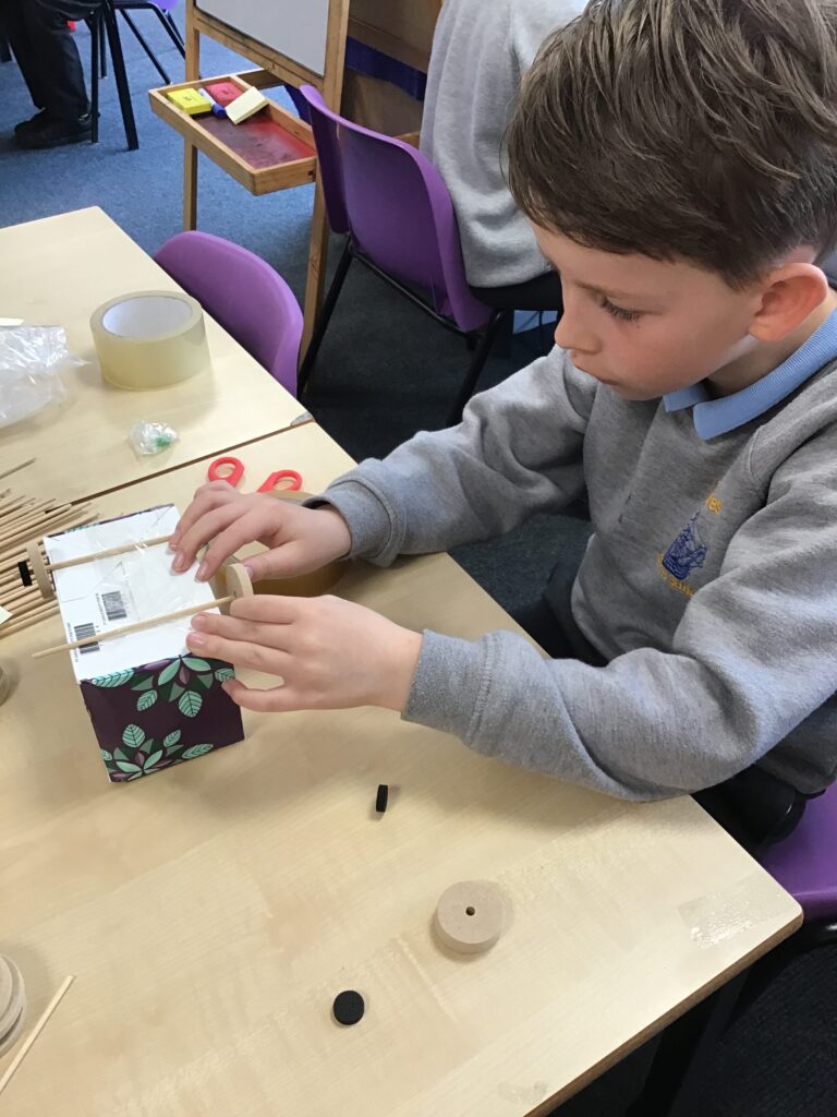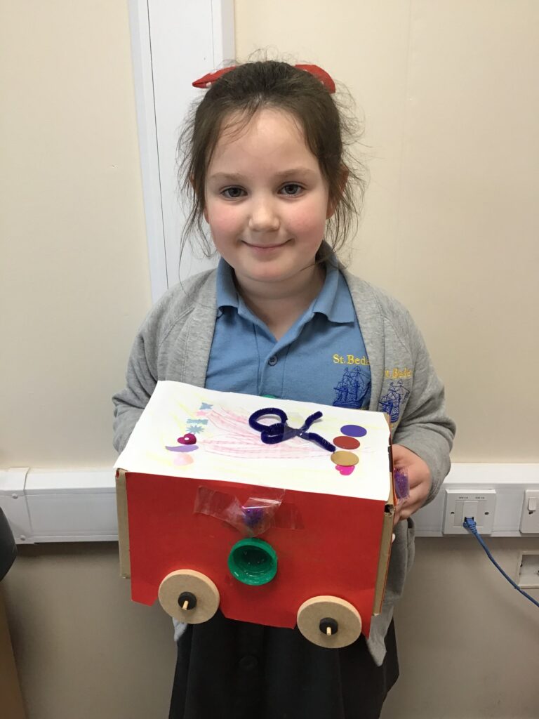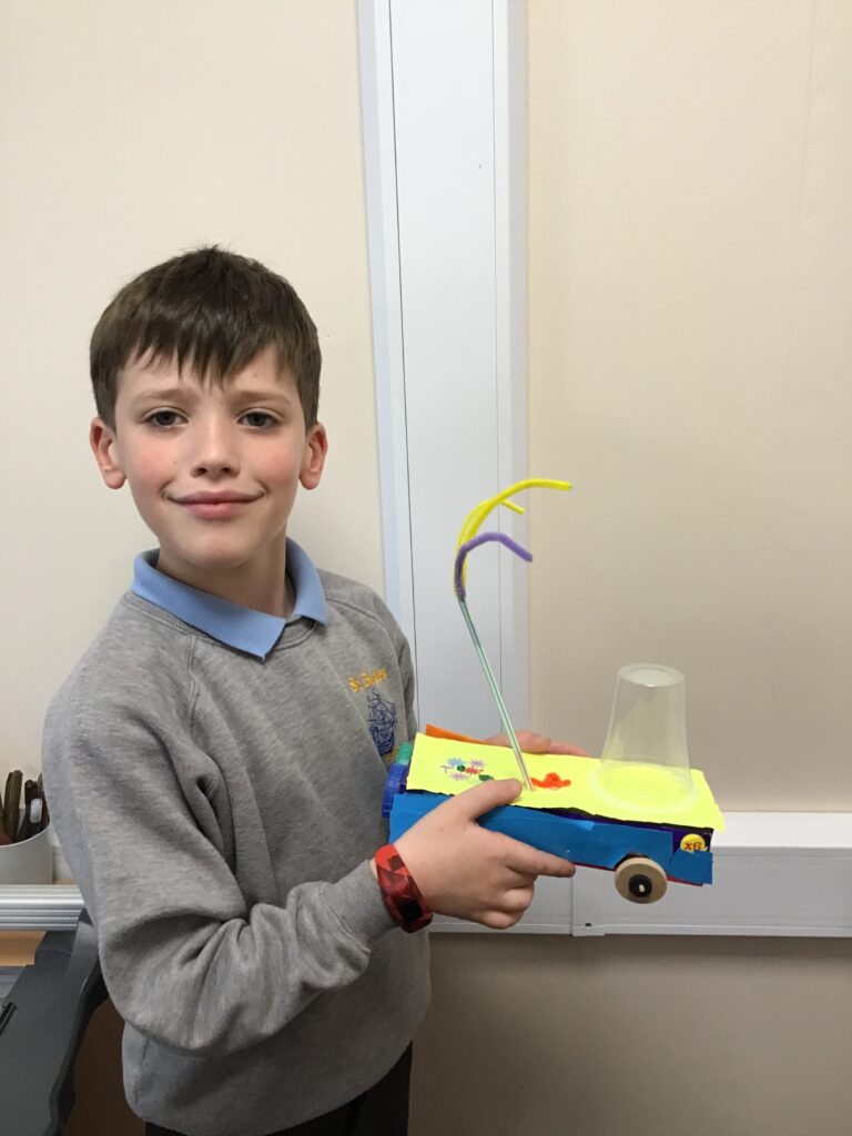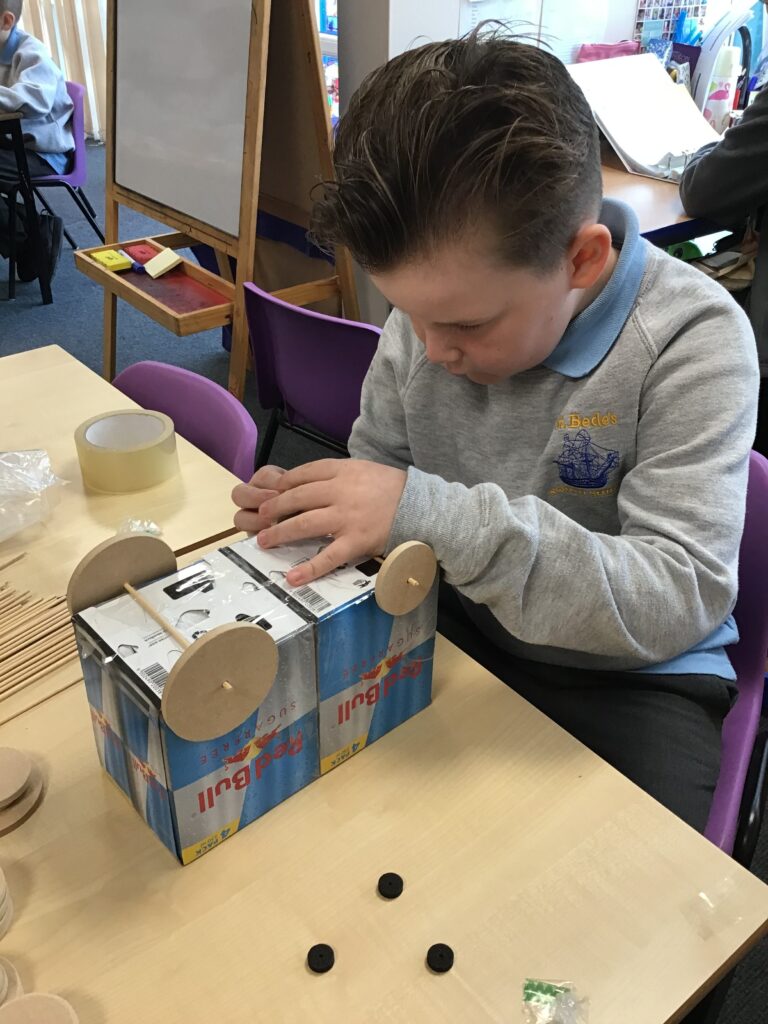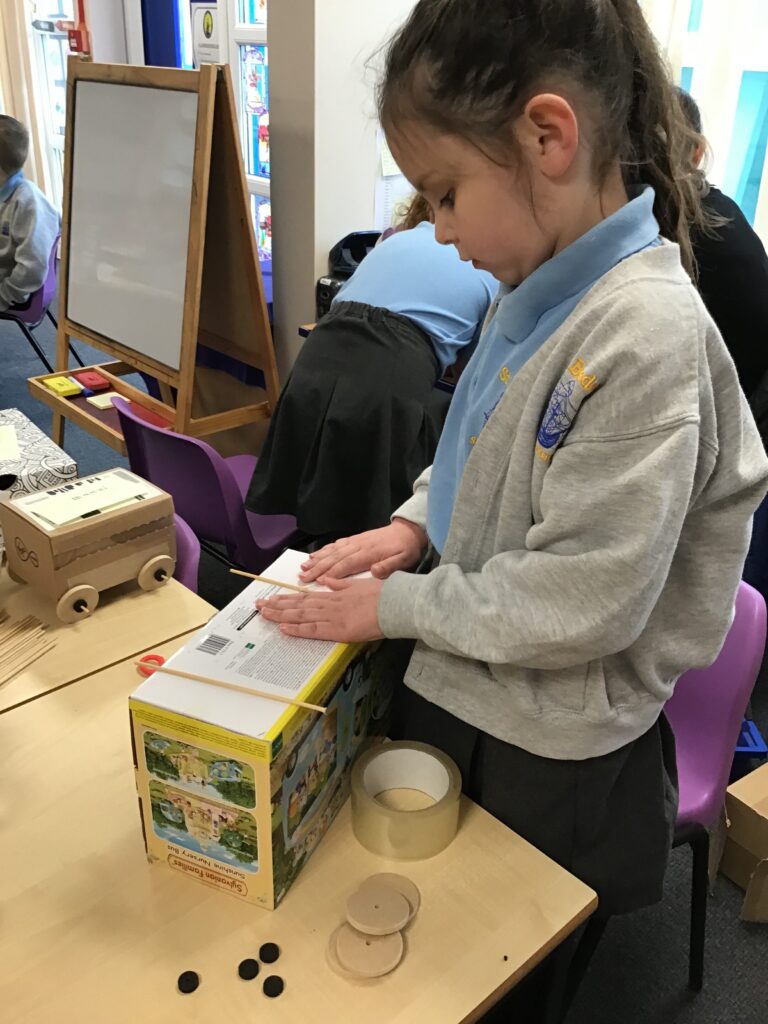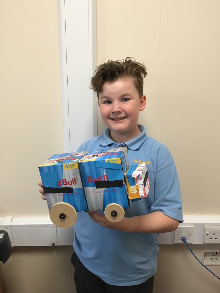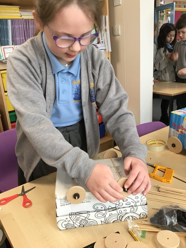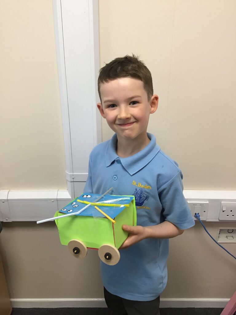Today Year 2 created vehicles as part of their Design and Technology unit, wheels and axles. The children used their designs from the previous lesson to create their wonderful vehicles. They used a range of tools to cut wooden axles and used washers to secure each wheel. They explored a range of materials to help make their vehicles stronger and more stable. To finish the children used lots of crafts to finish and embellish their vehicles, using bottle tops for lids and seats! Here are some pictures of the children in action and also their final products.