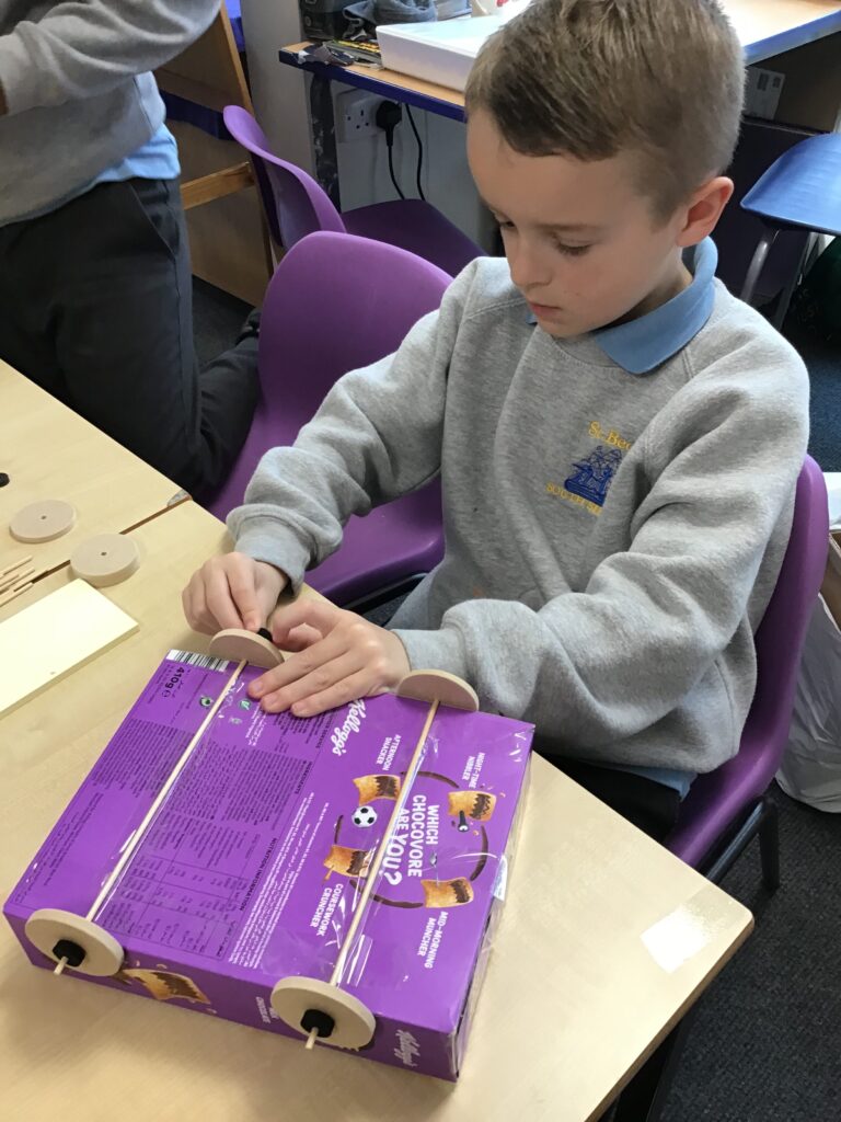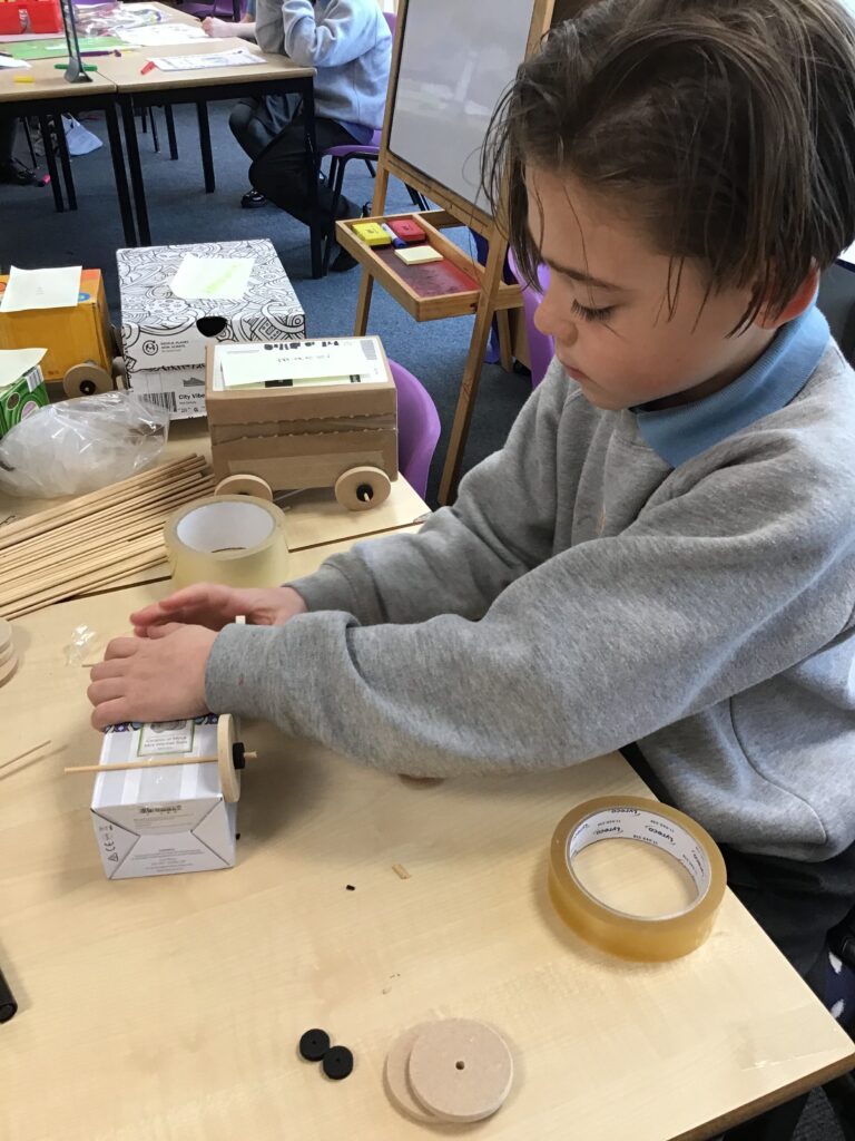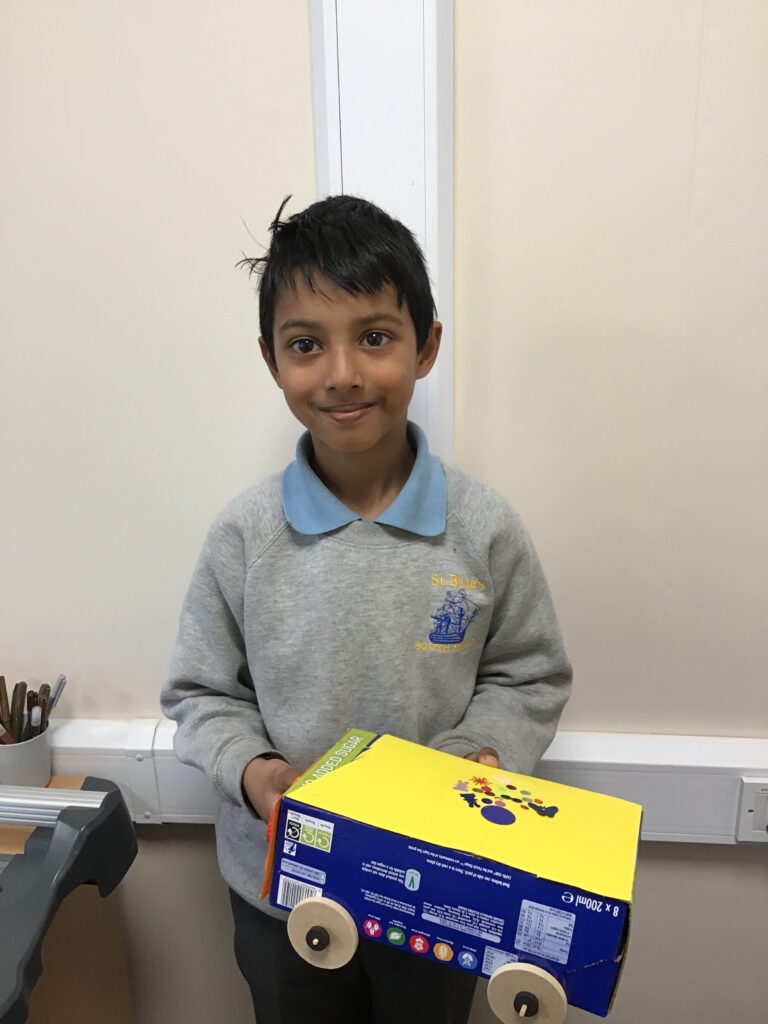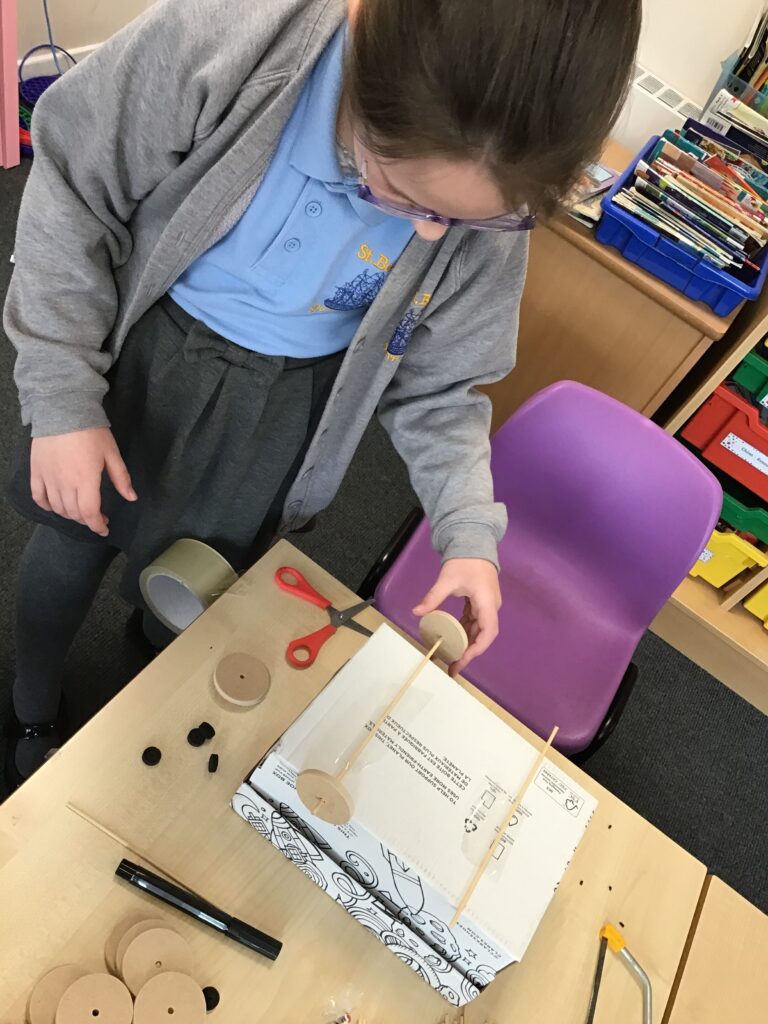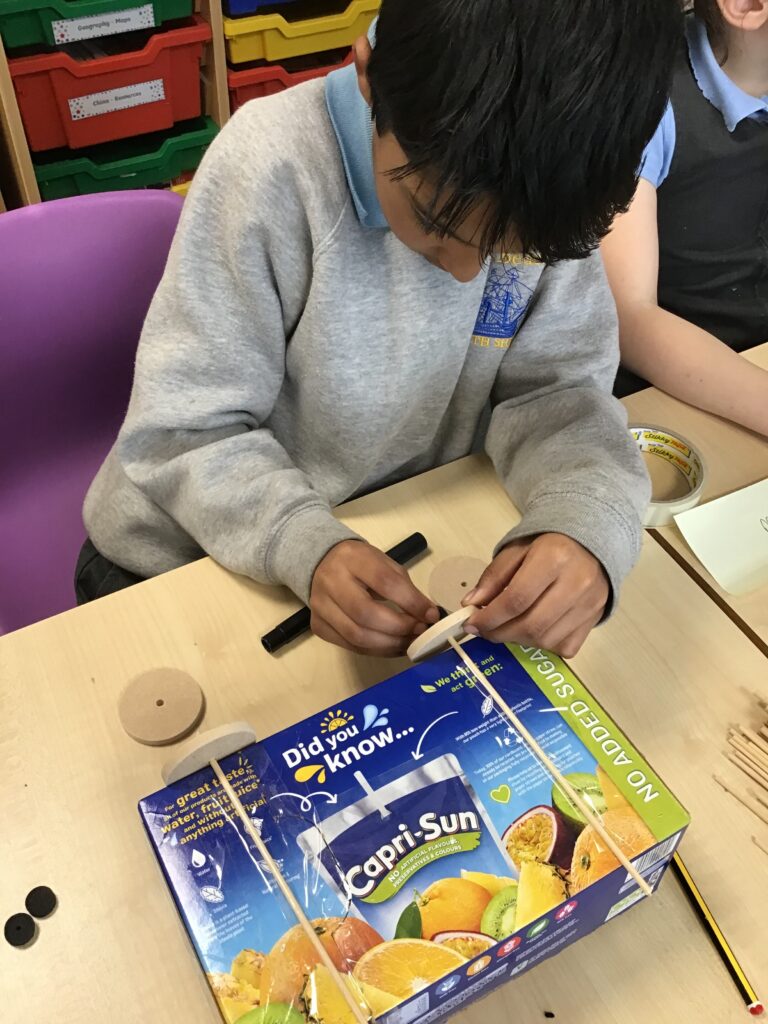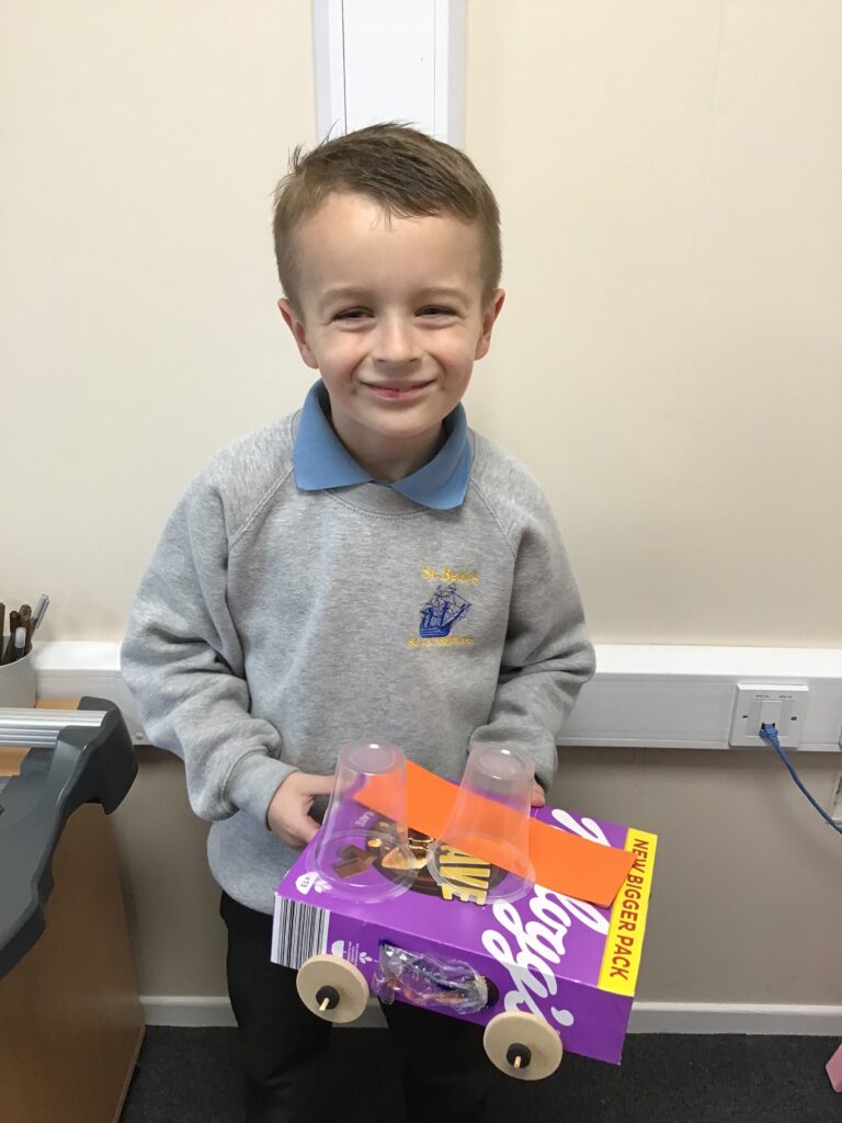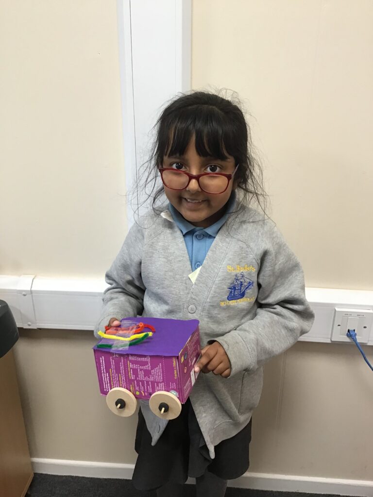 Today Year 2 created vehicles as part of their Design and Technology unit, wheels and axles. The children used their designs from the previous lesson to create their wonderful vehicles. They used a range of tools to cut wooden axles and used washers to secure each wheel. They explored a range of materials to help make their vehicles stronger and more stable. To finish the children used lots of crafts to finish and embellish their vehicles, using bottle tops for lids and seats! Here are some pictures of the children in action and also their final products.