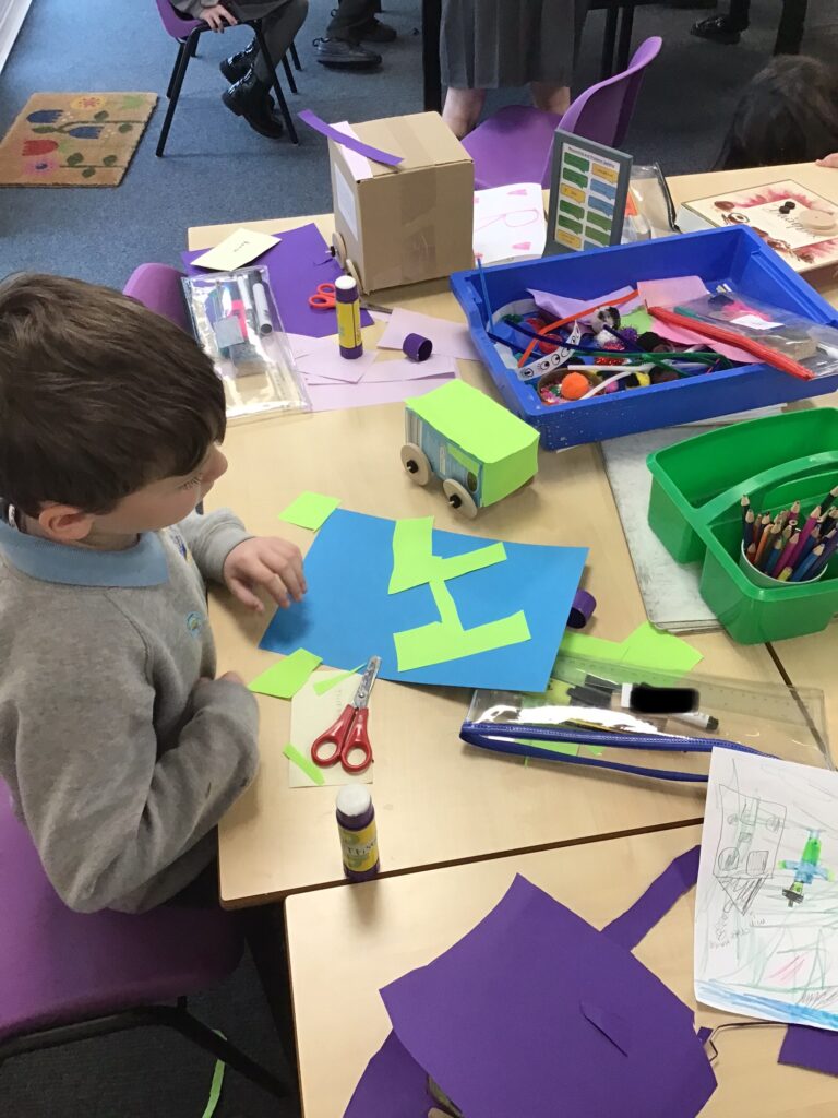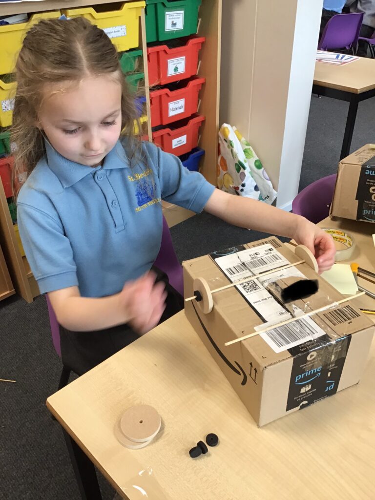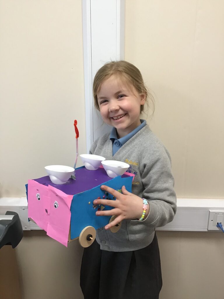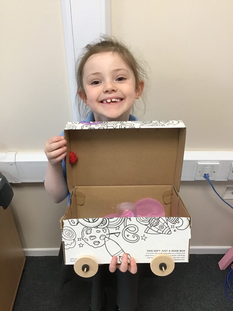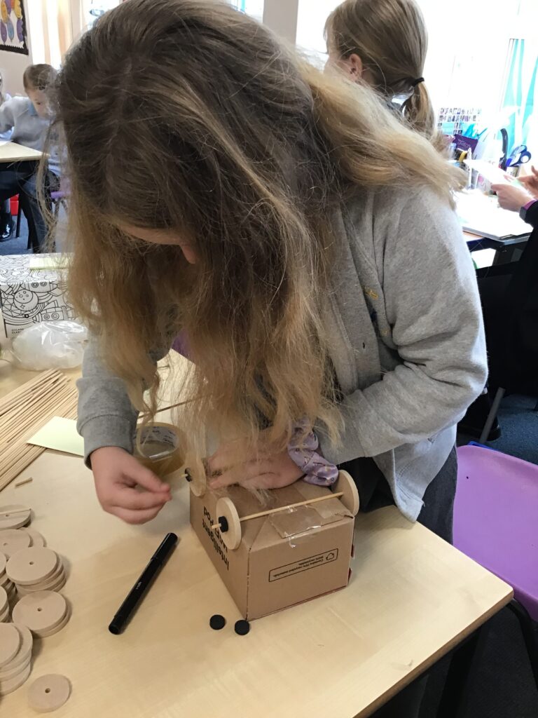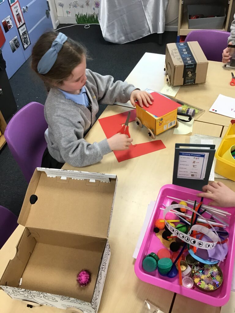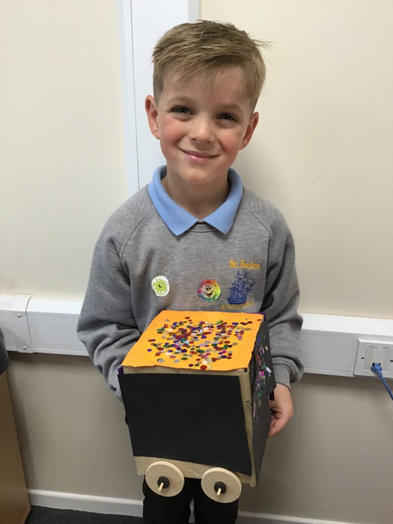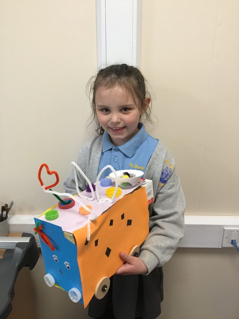 Today Year 2 created vehicles as part of their Design and Technology unit, wheels and axles. The children used their designs from the previous lesson to create their wonderful vehicles. They used a range of tools to cut wooden axles and used washers to secure each wheel. They explored a range of materials to help make their vehicles stronger and more stable. To finish the children used lots of crafts to finish and embellish their vehicles, using bottle tops for lids and seats! Here are some pictures of the children in action and also their final products.