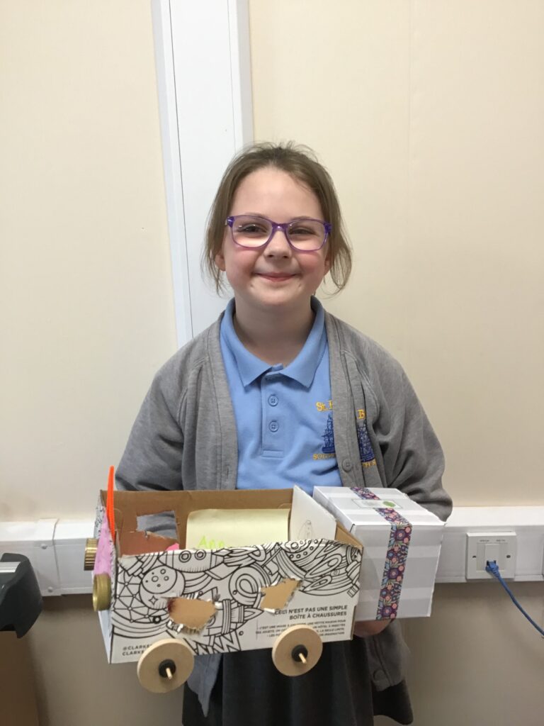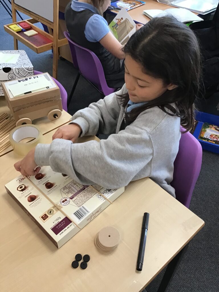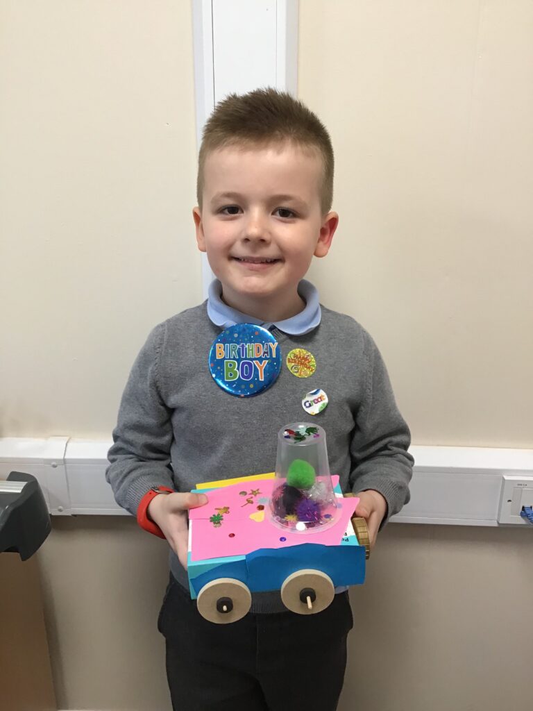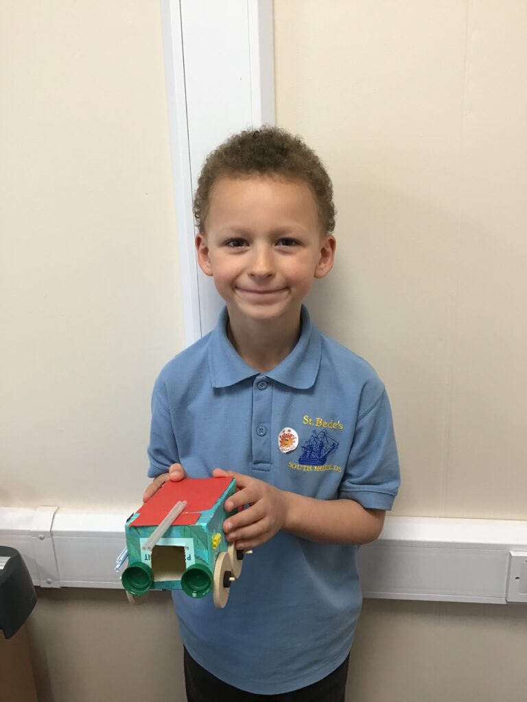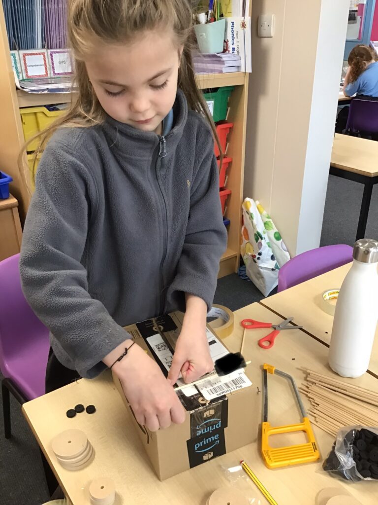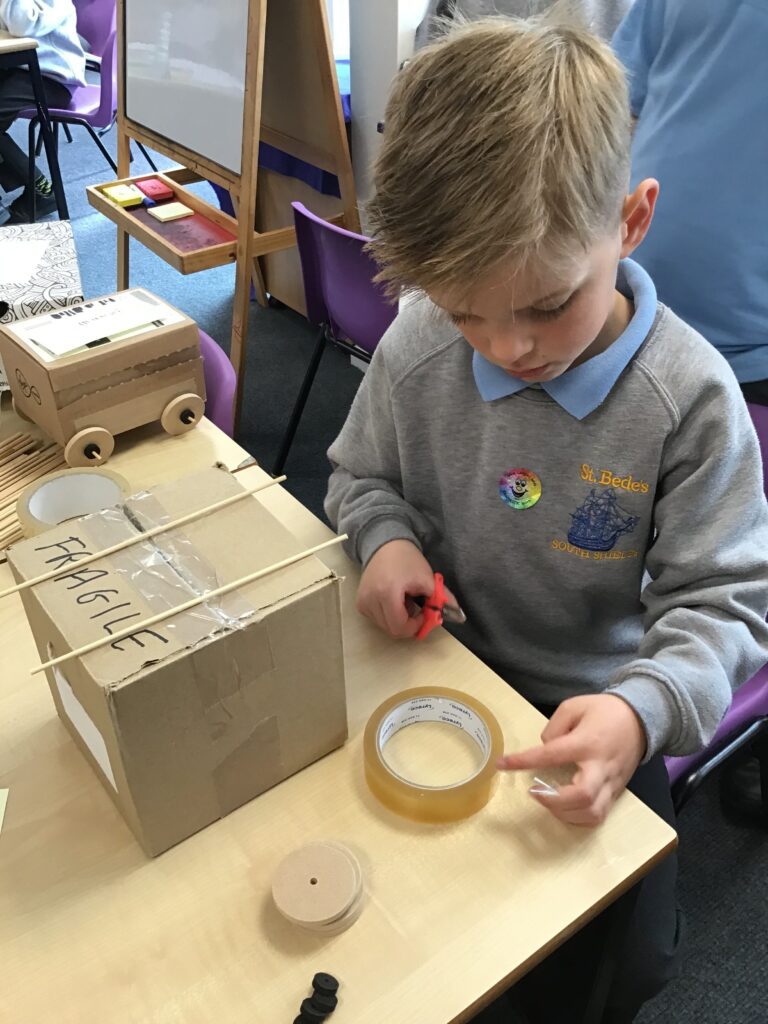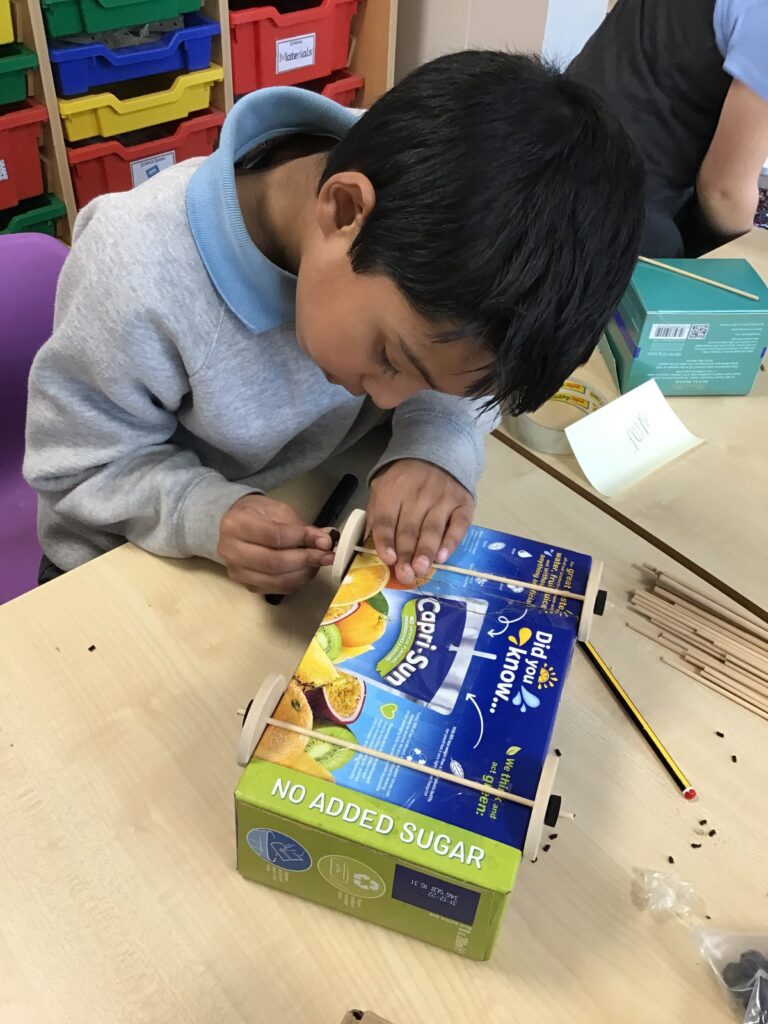 Today Year 2 created vehicles as part of their Design and Technology unit, wheels and axles. The children used their designs from the previous lesson to create their wonderful vehicles. They used a range of tools to cut wooden axles and used washers to secure each wheel. They explored a range of materials to help make their vehicles stronger and more stable. To finish the children used lots of crafts to finish and embellish their vehicles, using bottle tops for lids and seats! Here are some pictures of the children in action and also their final products.