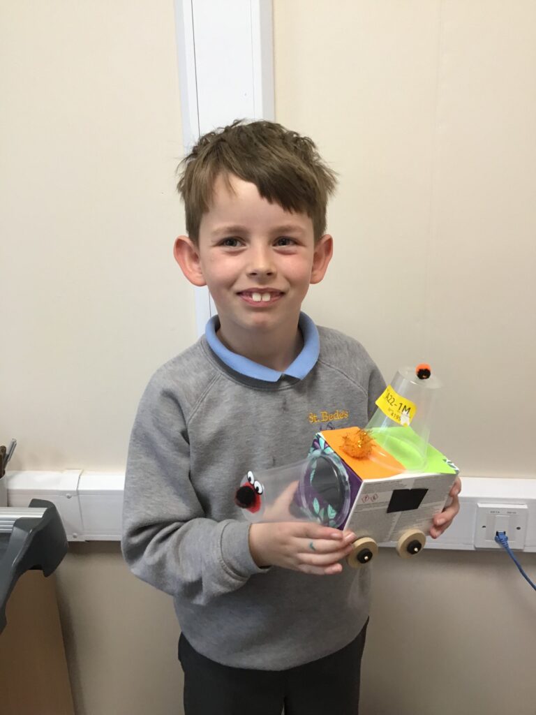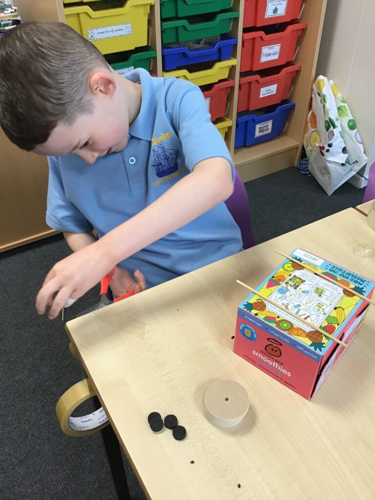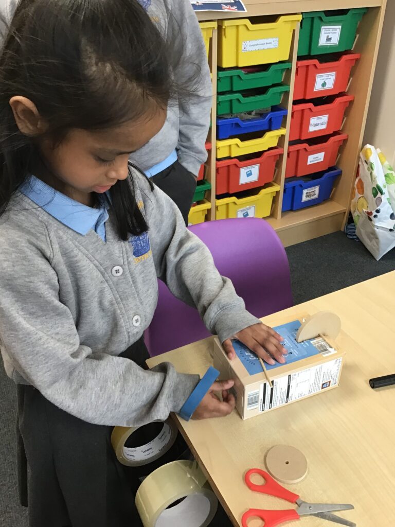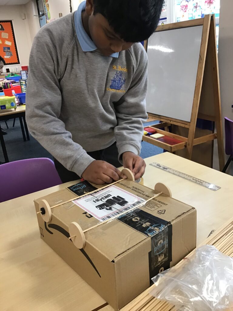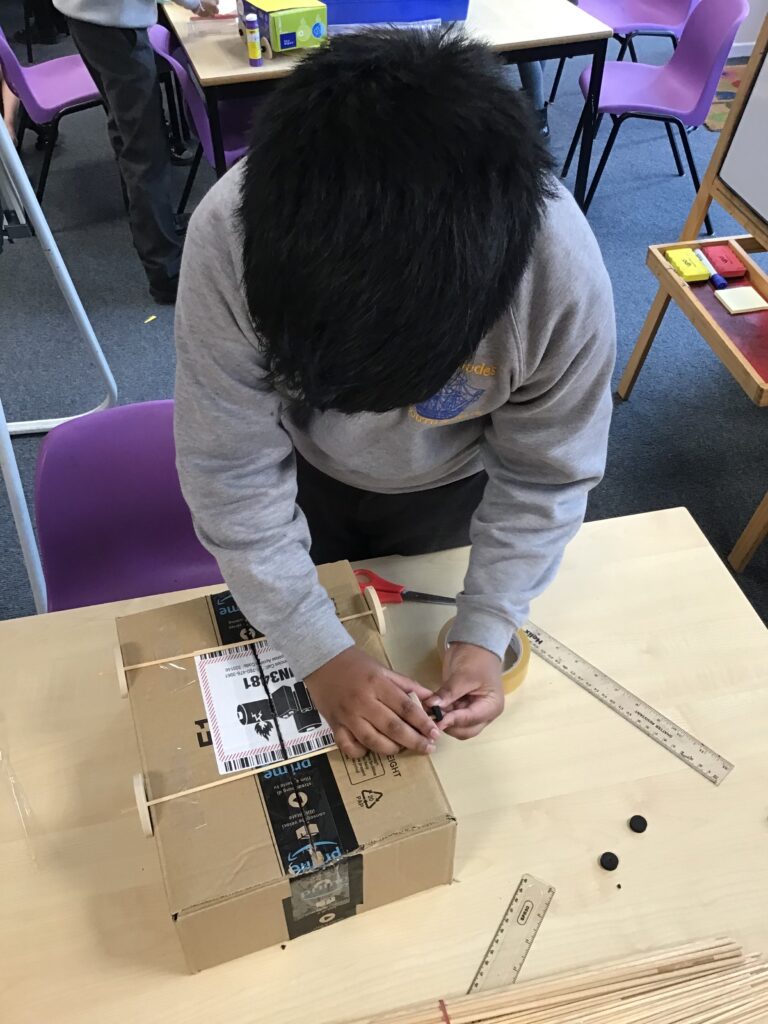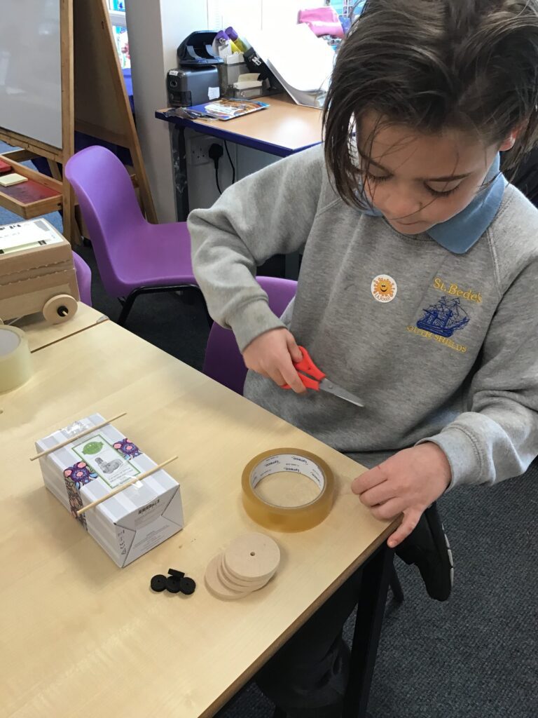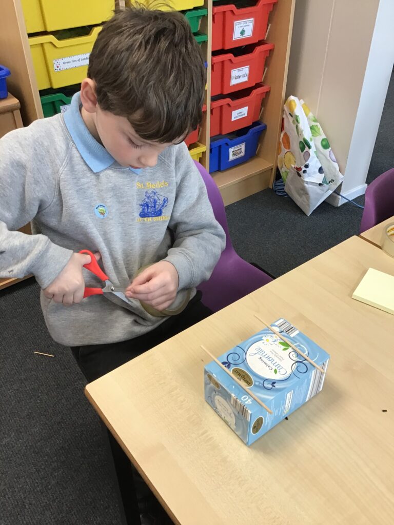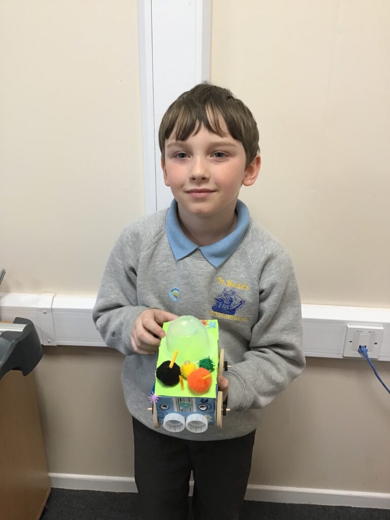 Today Year 2 created vehicles as part of their Design and Technology unit, wheels and axles. The children used their designs from the previous lesson to create their wonderful vehicles. They used a range of tools to cut wooden axles and used washers to secure each wheel. They explored a range of materials to help make their vehicles stronger and more stable. To finish the children used lots of crafts to finish and embellish their vehicles, using bottle tops for lids and seats! Here are some pictures of the children in action and also their final products.