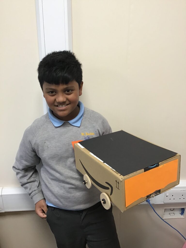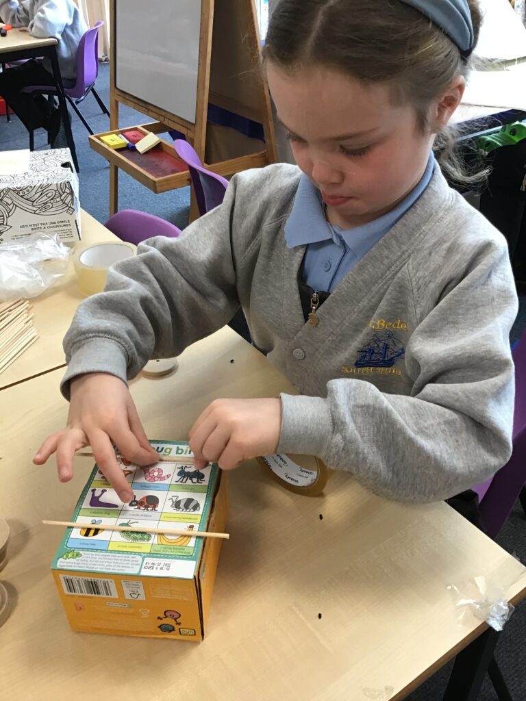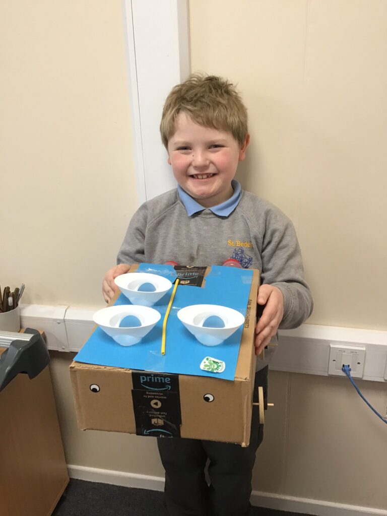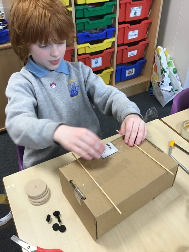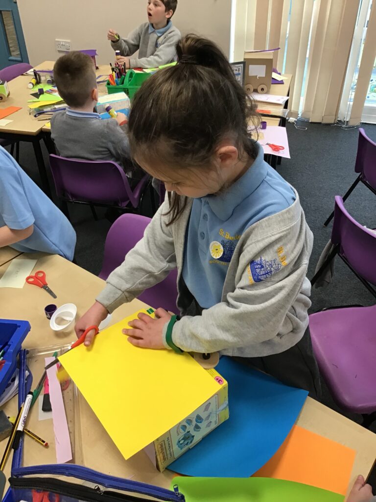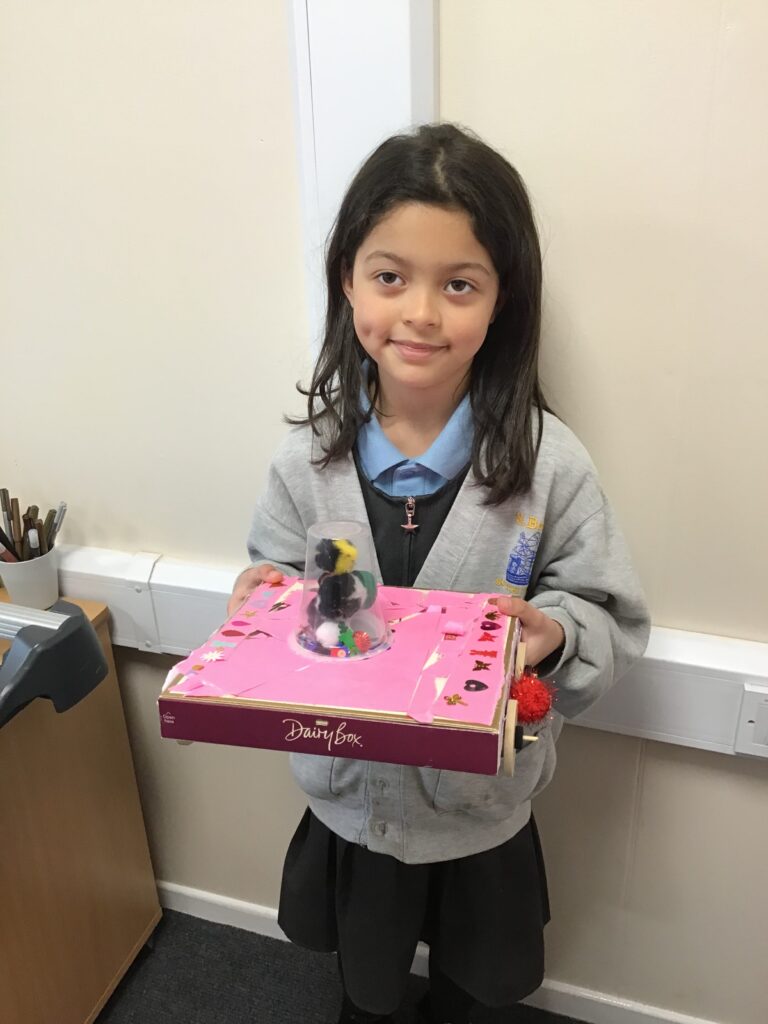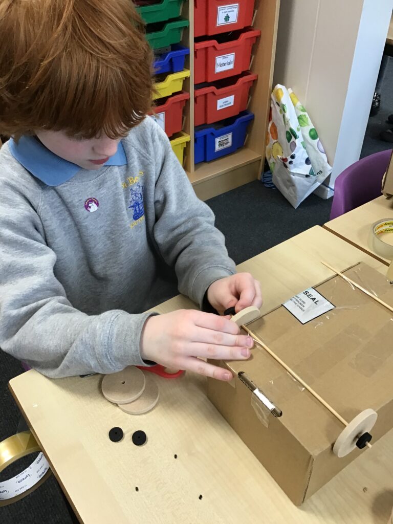 Today Year 2 created vehicles as part of their Design and Technology unit, wheels and axles. The children used their designs from the previous lesson to create their wonderful vehicles. They used a range of tools to cut wooden axles and used washers to secure each wheel. They explored a range of materials to help make their vehicles stronger and more stable. To finish the children used lots of crafts to finish and embellish their vehicles, using bottle tops for lids and seats! Here are some pictures of the children in action and also their final products.