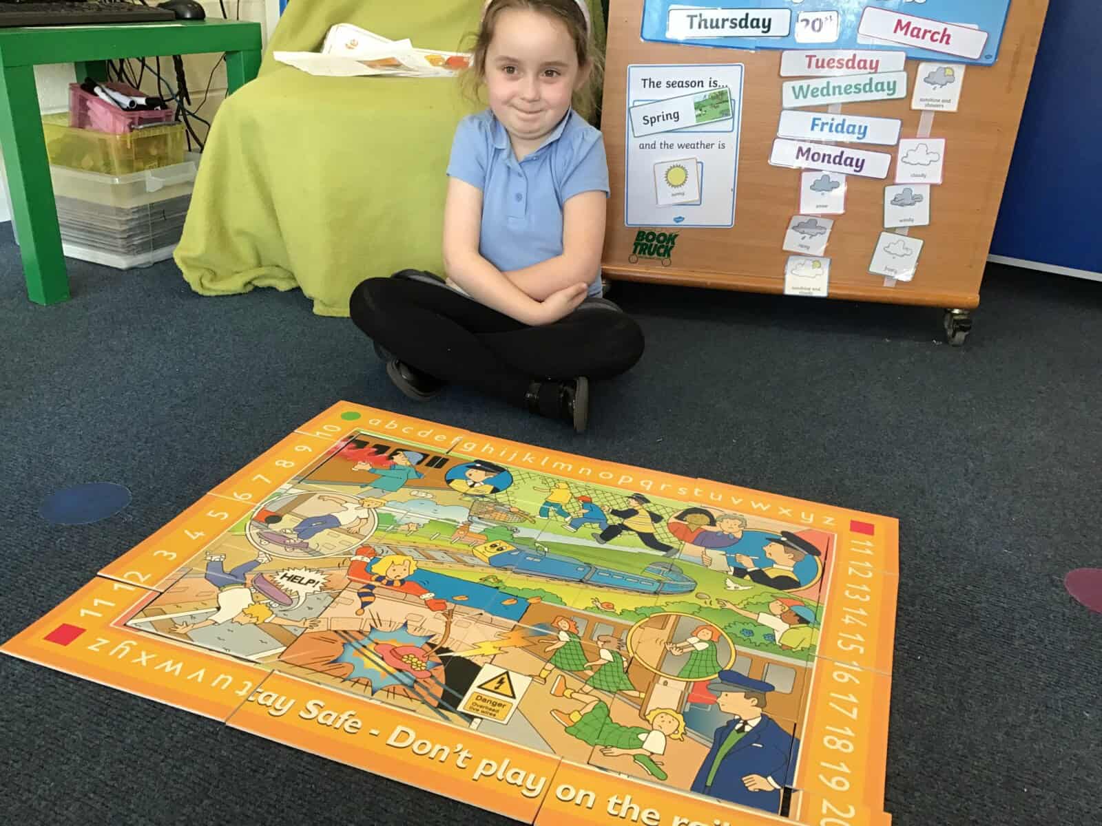 We talked about metro and train safety and the colour of traffic lights. We discussed how to behave on the platform and on the train. We completed a train puzzle too!