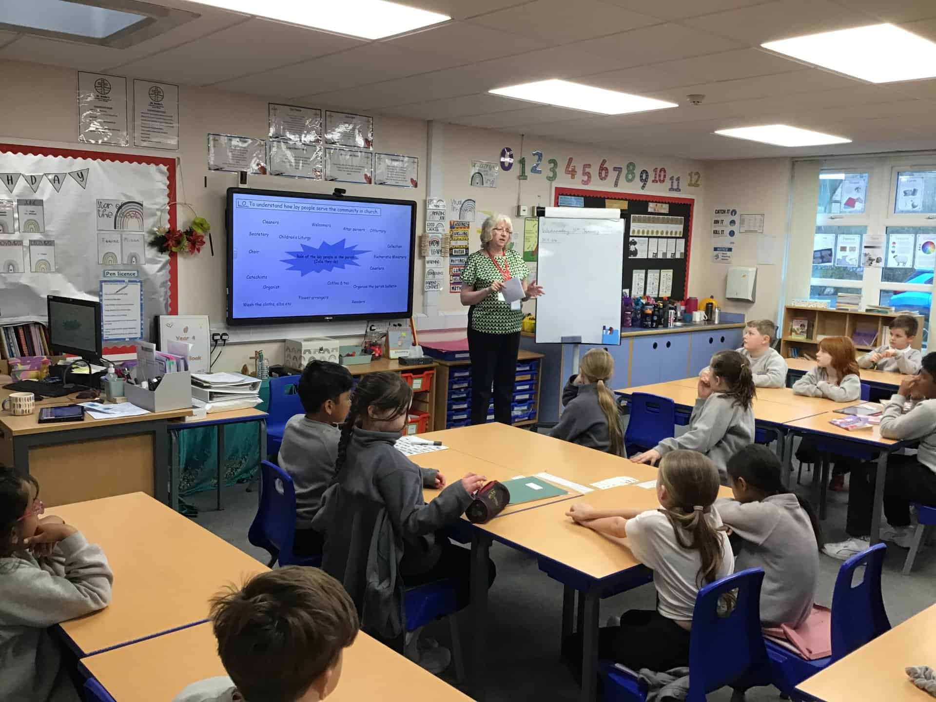 As part of our Local Church topic in RE, we were fortunate to welcome Mrs Brown into school to talk about the role the laity plays in Church.  It was very interesting – the children learned a lot about how we are all called to serve God in our own way, and the commitment and responsibility involved in people volunteering.