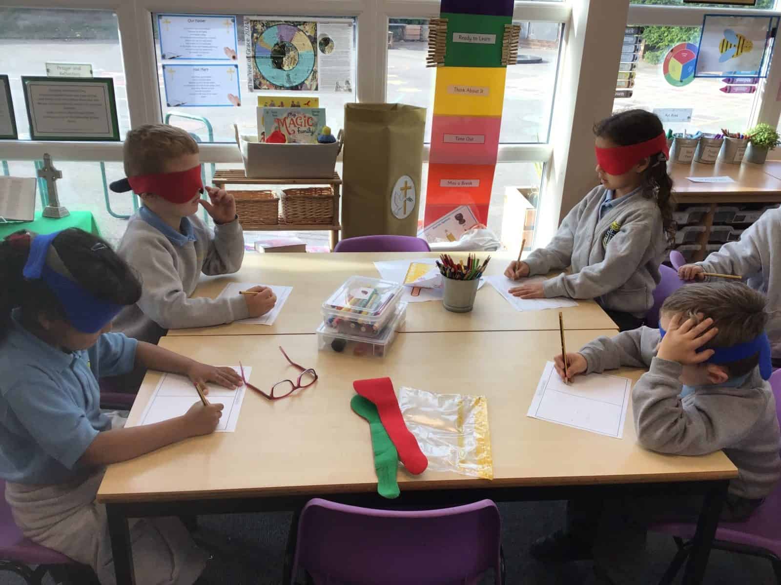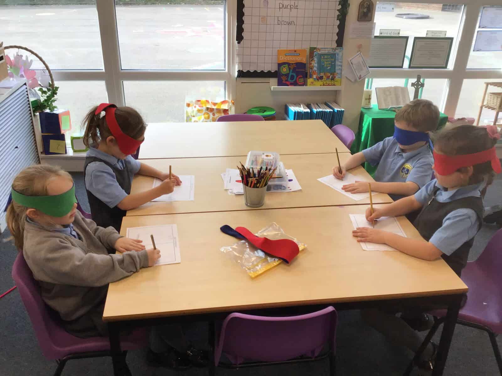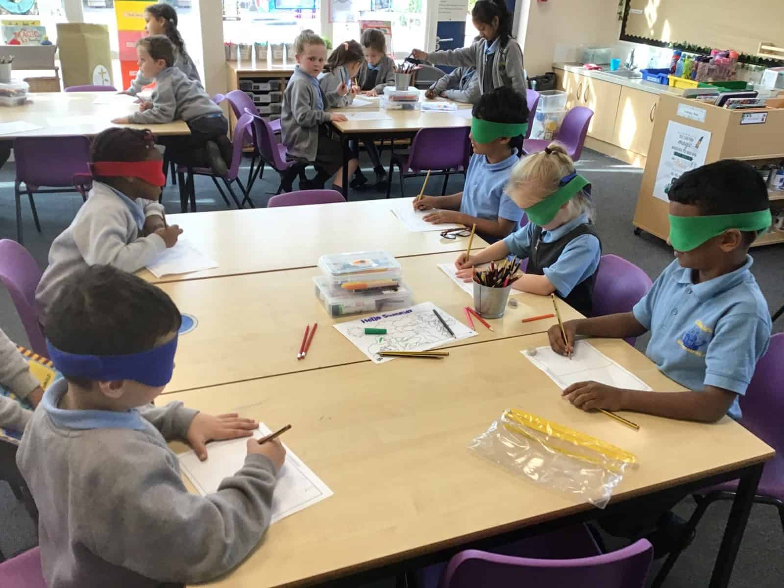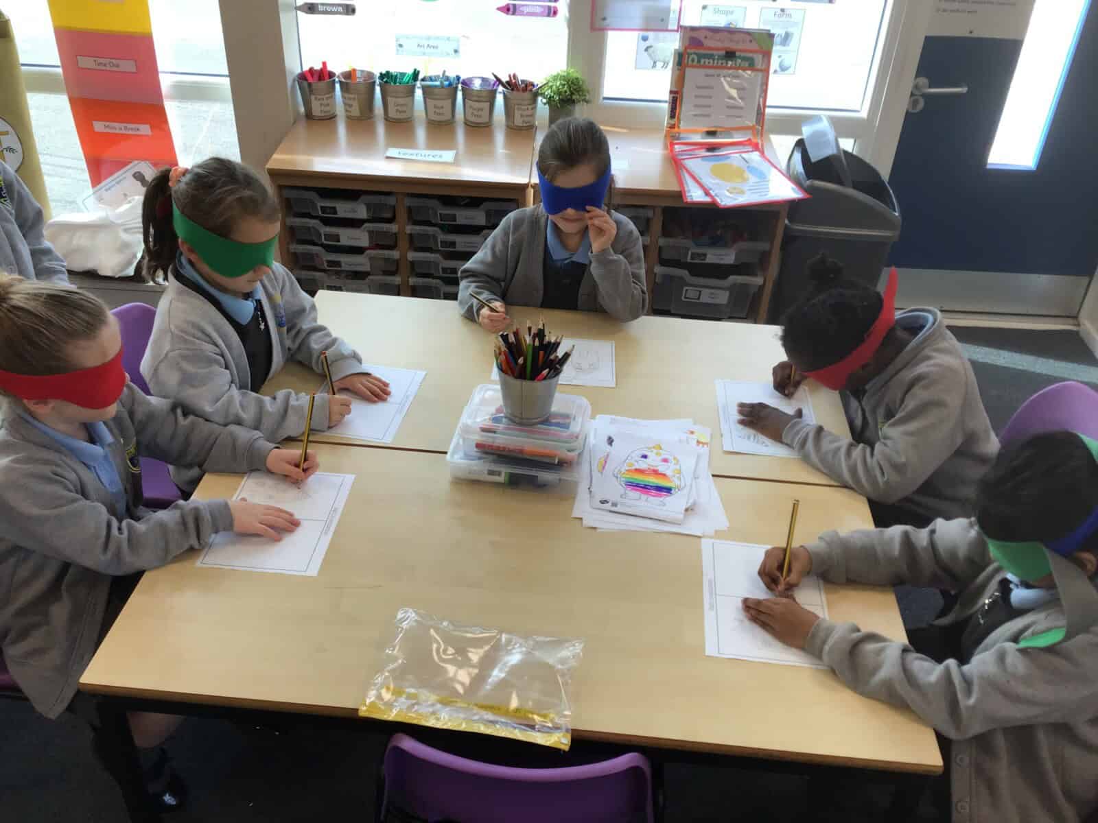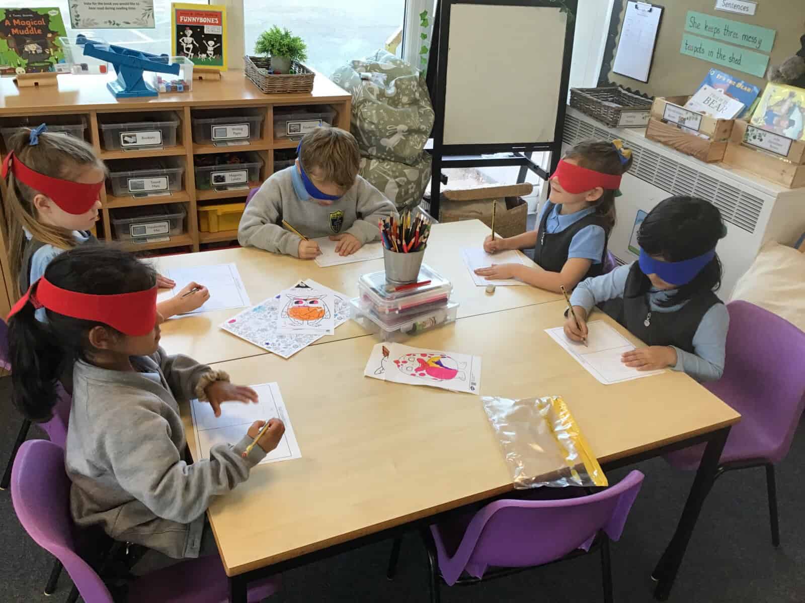 Next, we challenged the children to draw a house while blindfolded! It quickly became clear how important our eyes are for creating and observing details. With their blindfolds removed, they compared their drawings and enjoyed a good laugh!