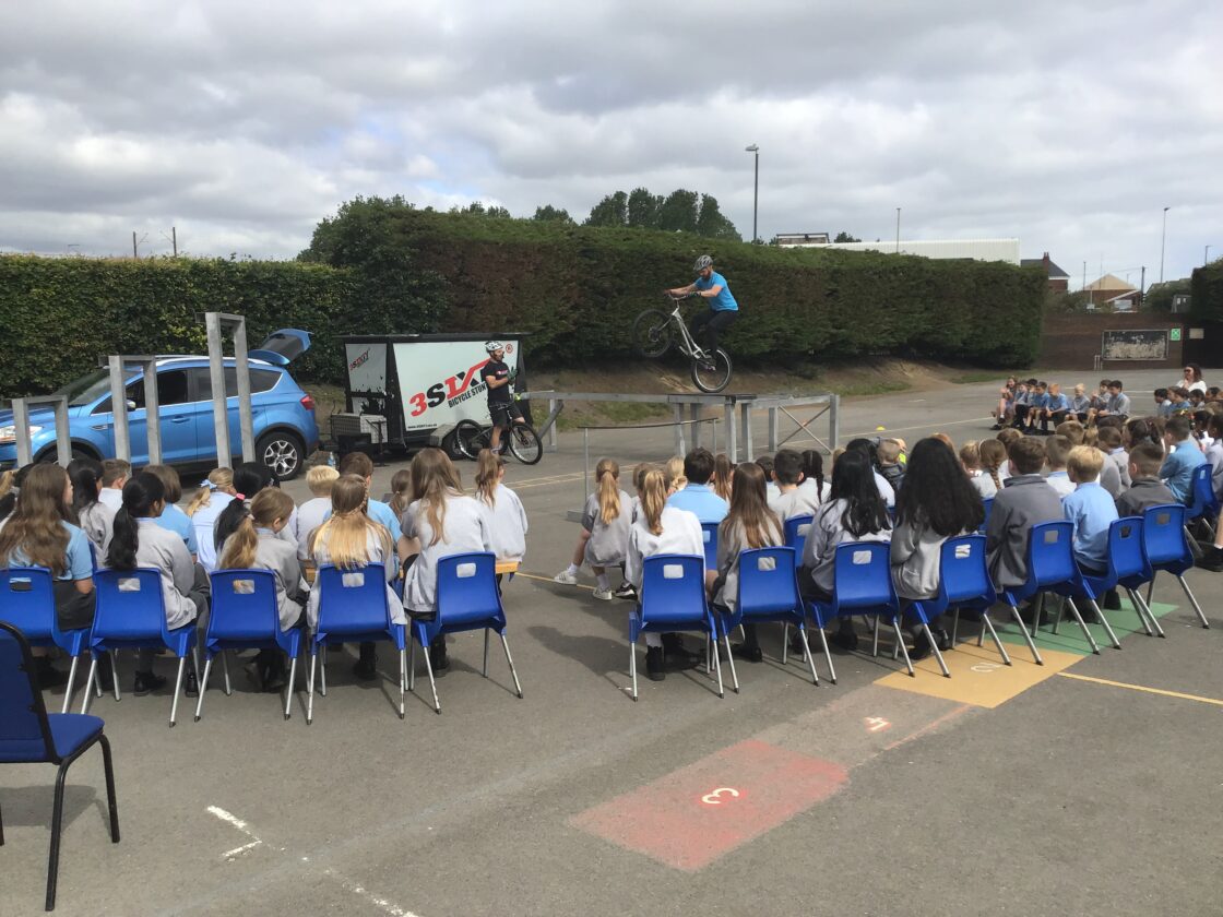KS2 enjoyed an excellent display this morning from Bike 3SIXTY, they saw bike tricks and stunts, learned tips on how to improve their balance when riding and learned about how practice and resilience lead to success!