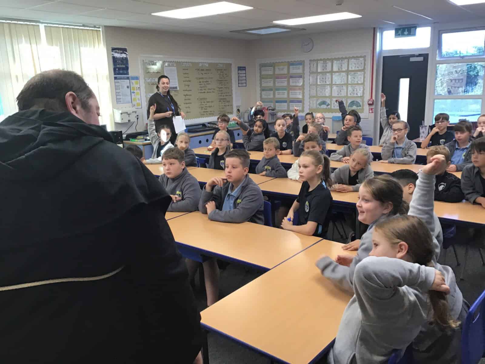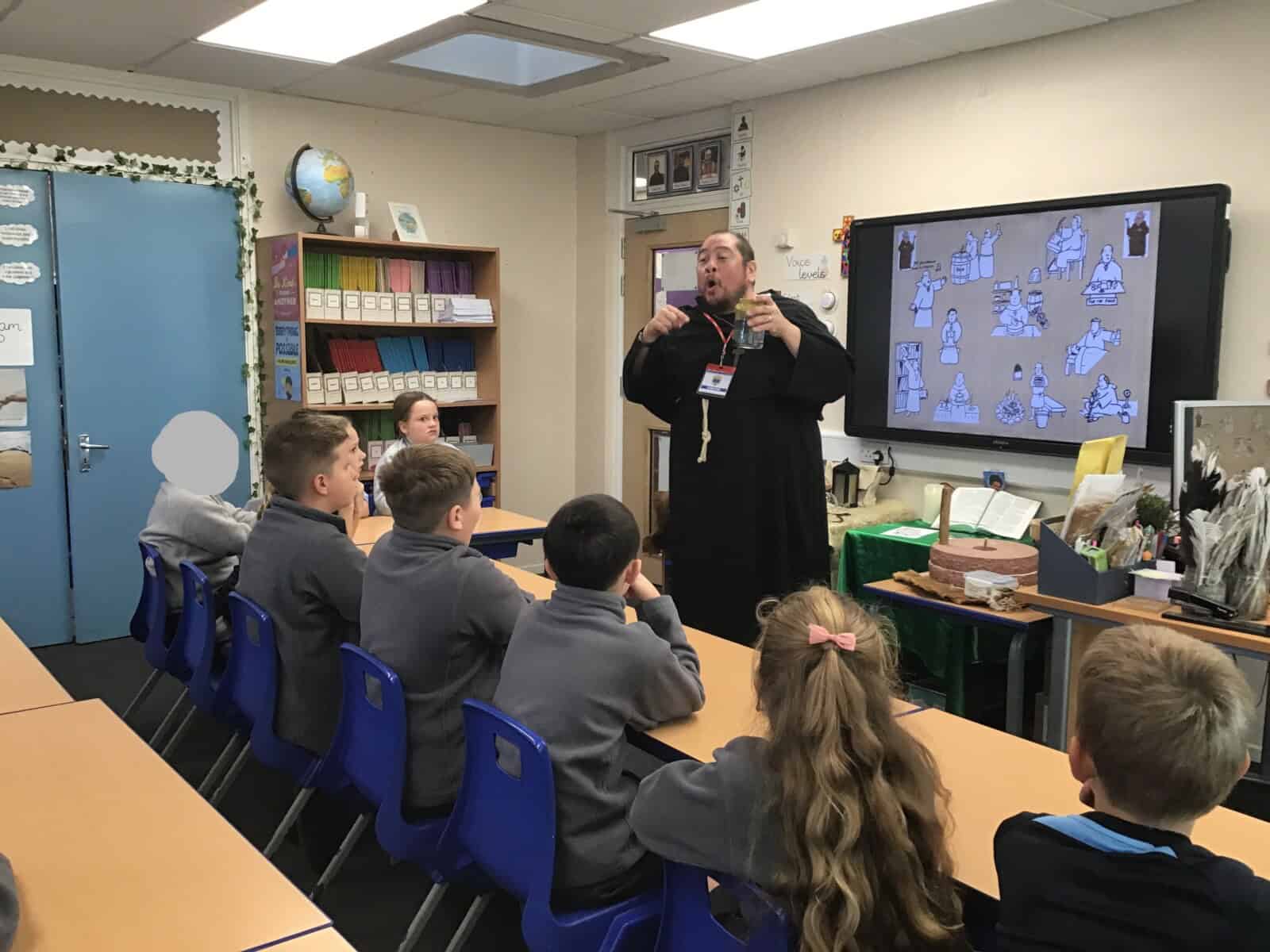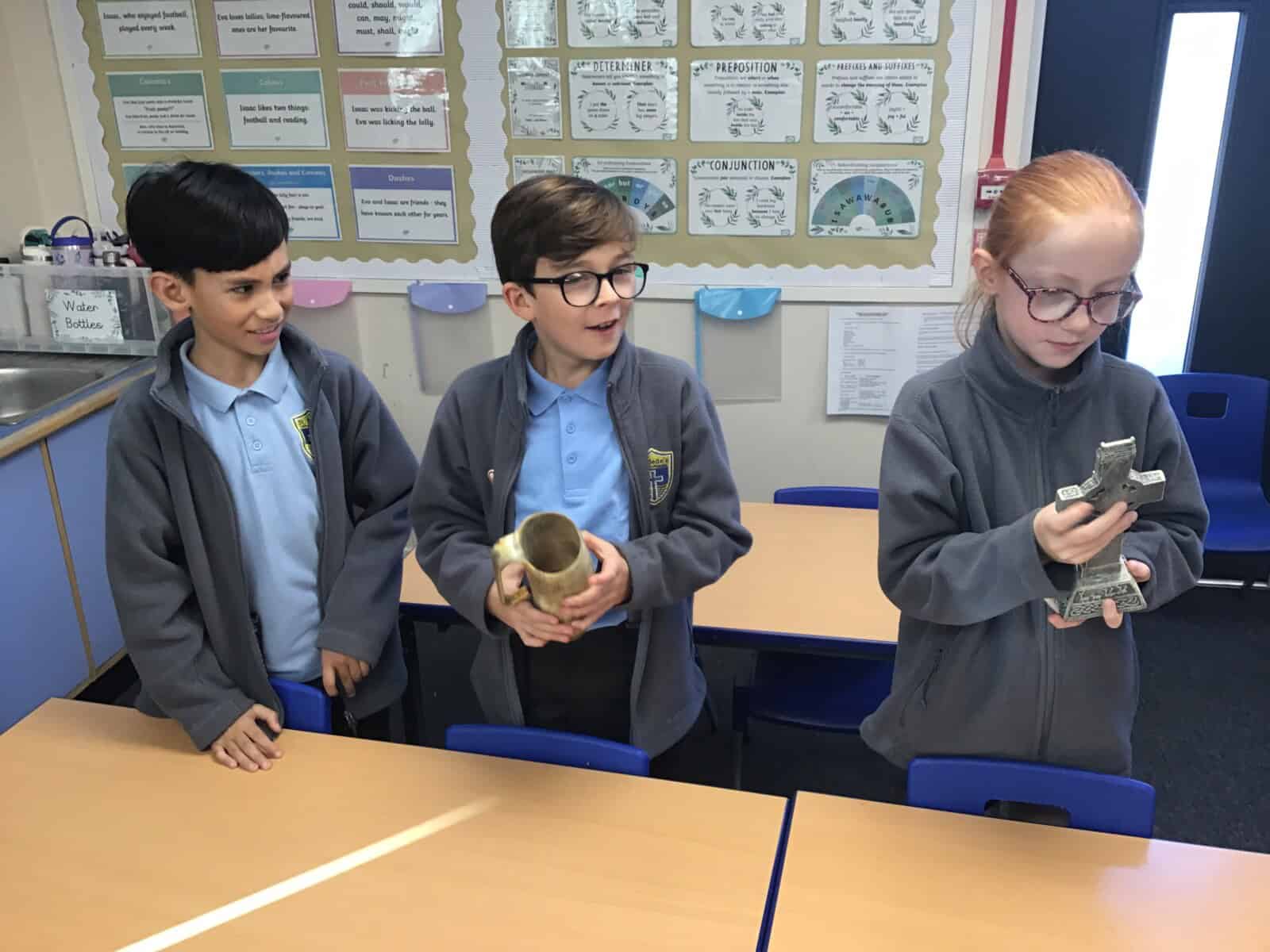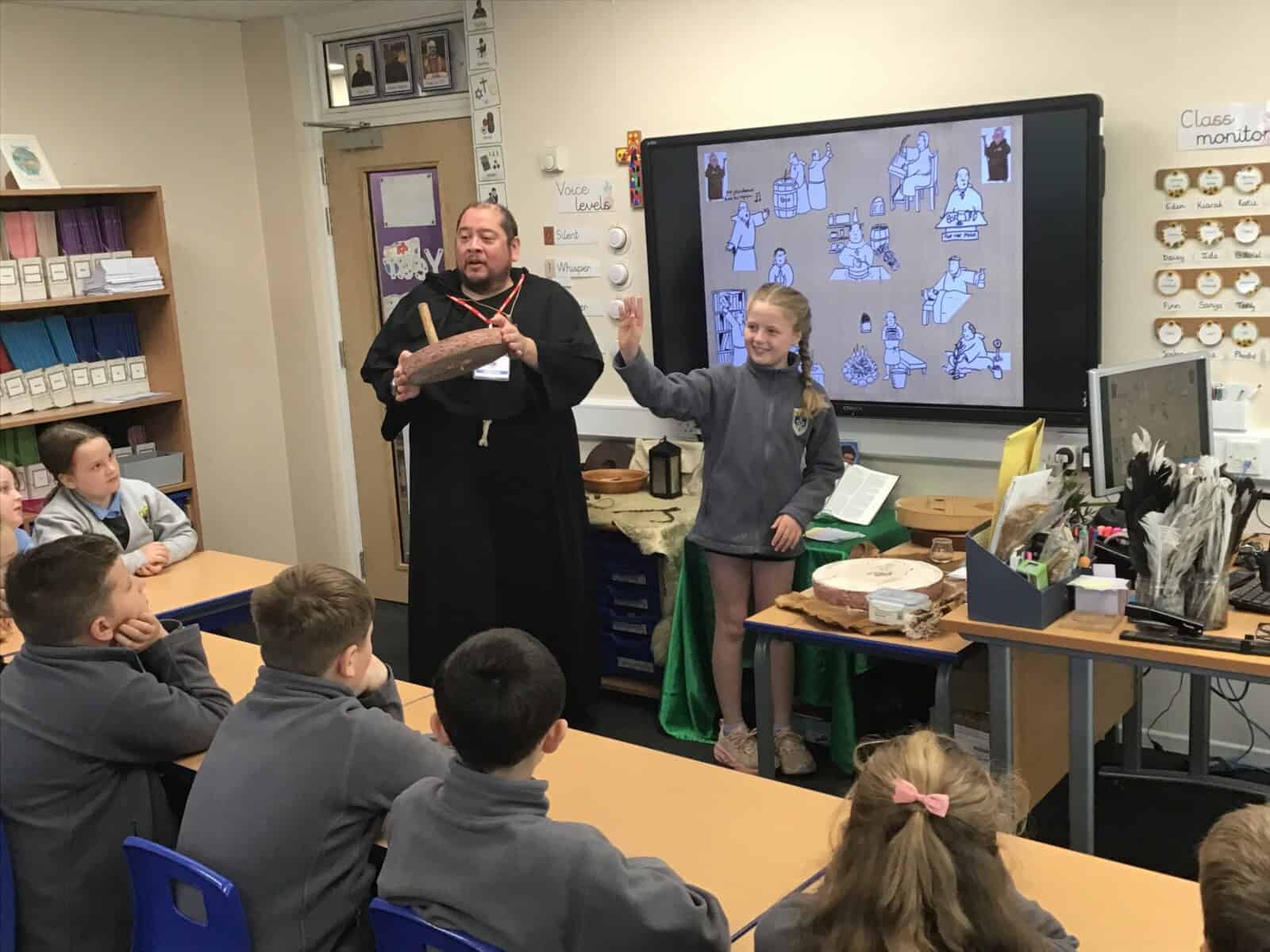 We explored the lives of Anglo Saxon monks and discovered how important they were. Richard really brought the past to life as he shared many aspects of Anglo Saxon times with us. The pupils loved learning sign language that was use by Anglo Saxon monks and handling different artefacts. Just as Richard intended, we learned lots and we had lots of fun!