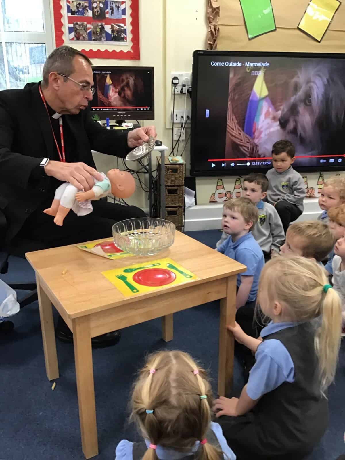 Father Bill visited nursery to show us how a priest baptises a baby. We talked about our own baptism.