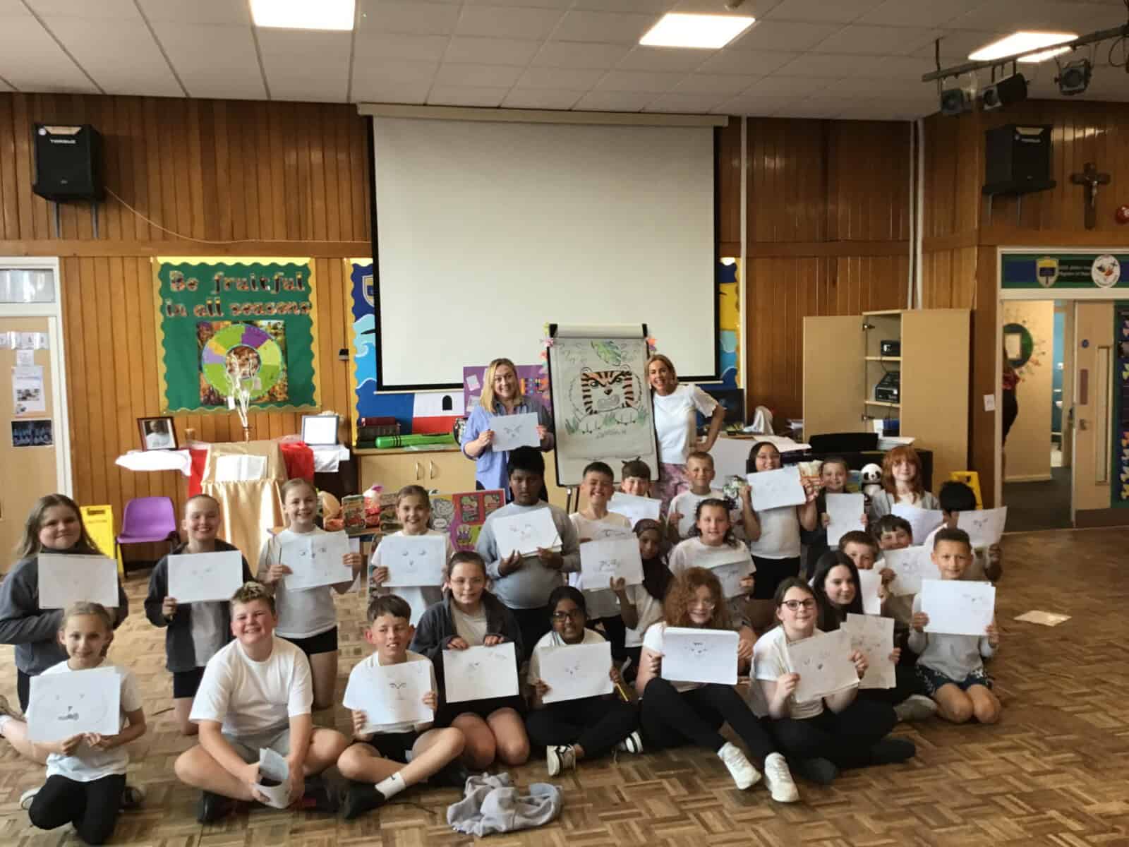 Throughout the day, each class took part in hands-on workshops led by Liz, where they learned some of her top tips for drawing. With a theme of ‘All God’s Creatures,’ the children explored how to bring animals to life on the page using simple shapes (like tacos, potatoes, and door arches) as the building blocks for their drawings. It was incredible to see how quickly Liz could create a character and even more exciting to see the amazing artwork the children produced using her techniques.