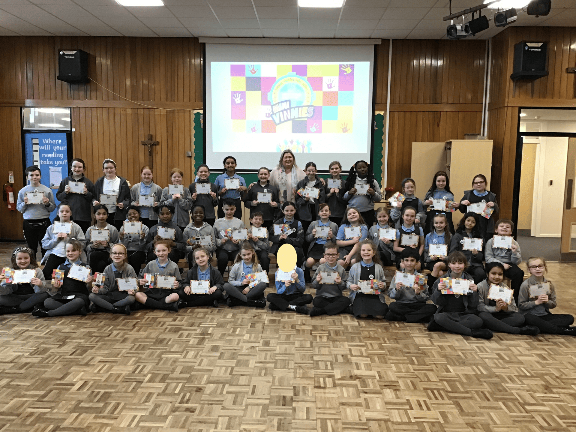 In the Autumn term, we asked for children to volunteer to become Mini Vinnies. We were astounded by the huge number of applications received from our KS2 children. It was so difficult to choose between the thoughtful applications of those children wanting to make a difference in their community, so, with over 40 applications, we decided to run 2 Mini Vinnies’ groups. Here they are being commissioned today.