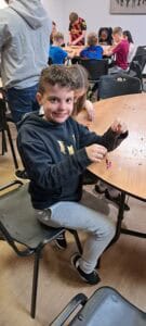 After a ‘restful night’, the children were up early and raring to go.  We ate breakfast together in the chalet, being waited on by Mrs Kennedy, Mrs Welsh and Mrs McDonald and then enjoyed a wake-up activity with the leaders Jamie, Becca, Mary and Ryan.  There was a carousel of activities: a blindfolded team challenge – “We walk by faith, not by sight…”; a craft activity during which the children made friendship bracelets; a CAFOD activity thinking about our neighbours around the world; and an art activity with the children making a banner about themselves and their unique gifts and talents.